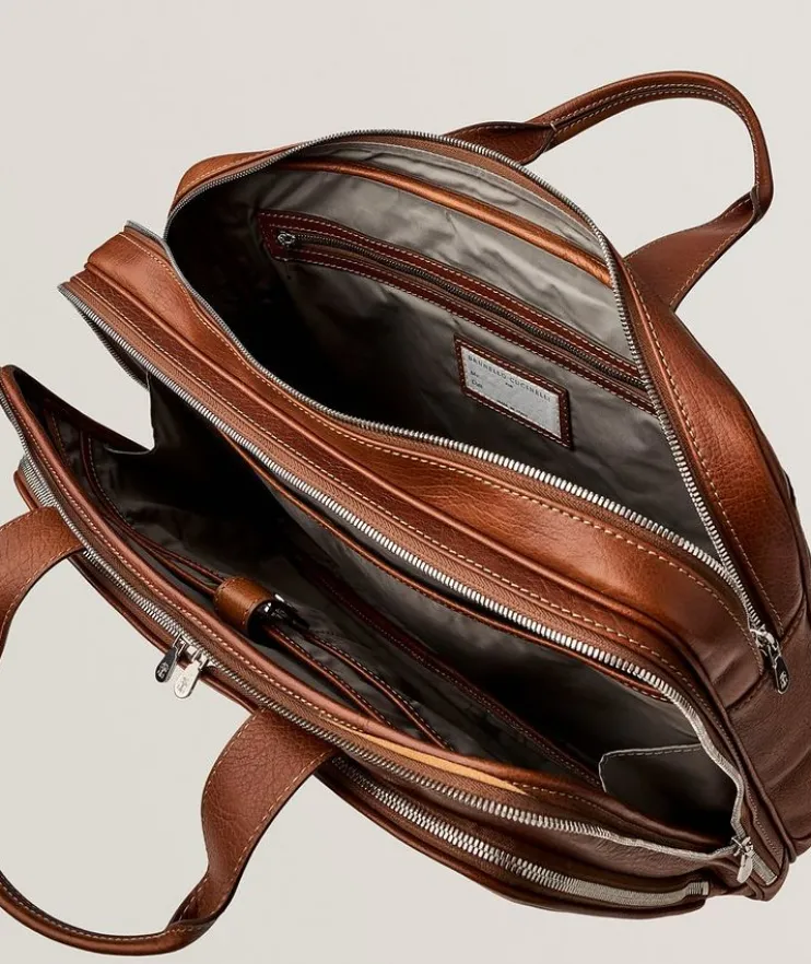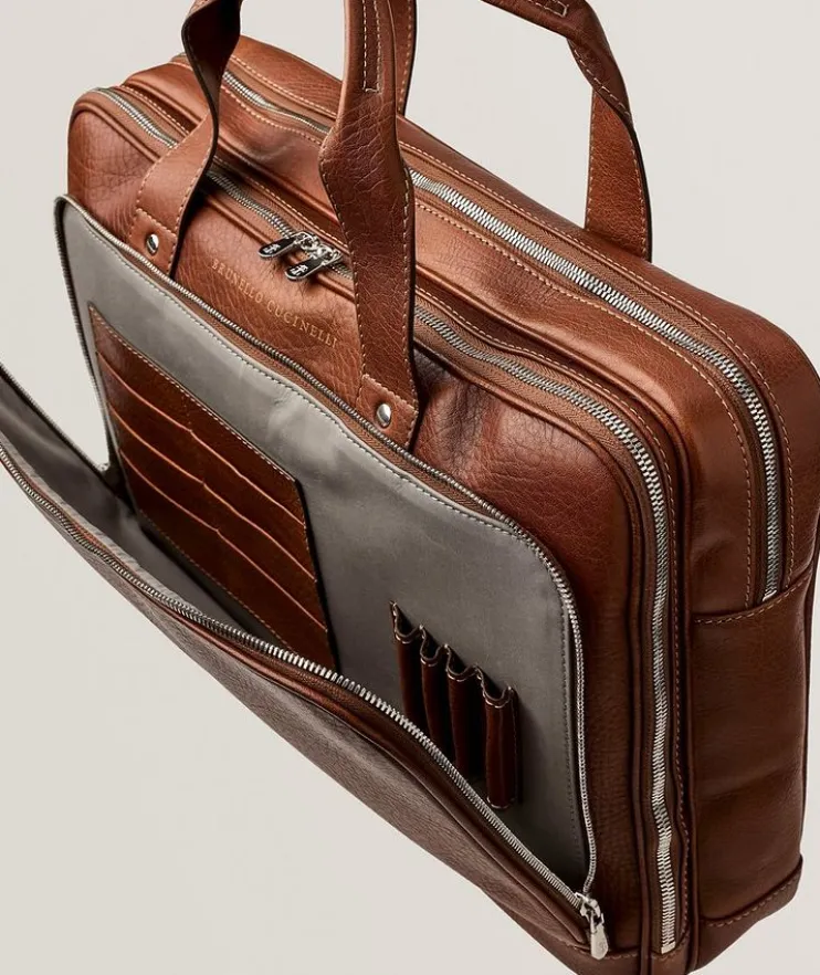 - Designed for your important meetings, this multi-compartment briefcase is crafted from grained calfskin leather and equipped with exterior and interior pockets to store and organize all of your essentials.