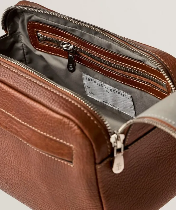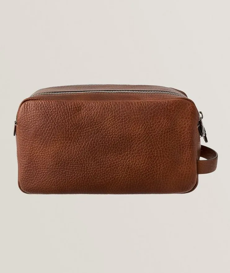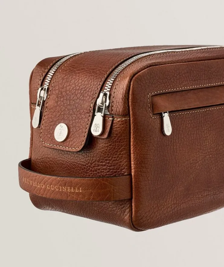 - A combination of function and style, this grained calfskin leather toiletry bag with double-zipper closure comes equipped with a spacious main compartment and zippered pockets for additional storage.