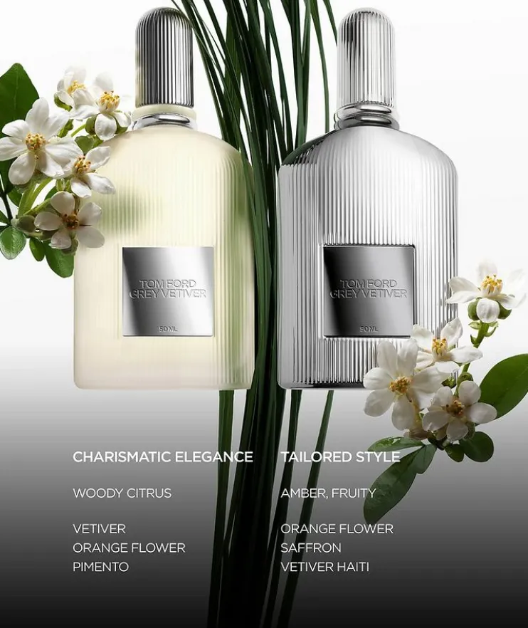 - Expressive to Tom Ford’s essence of philosophy, the Grey Vetiver eau de parfum (50 ml) captures an elegant and refined scent. The earthy and woody notes add warmth, while superbly blended with vetiver, orange flower and pimento elements to offer a citrus-like touch. Capture your absolute debonair, charismatic and provocative masculinity.