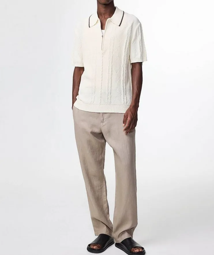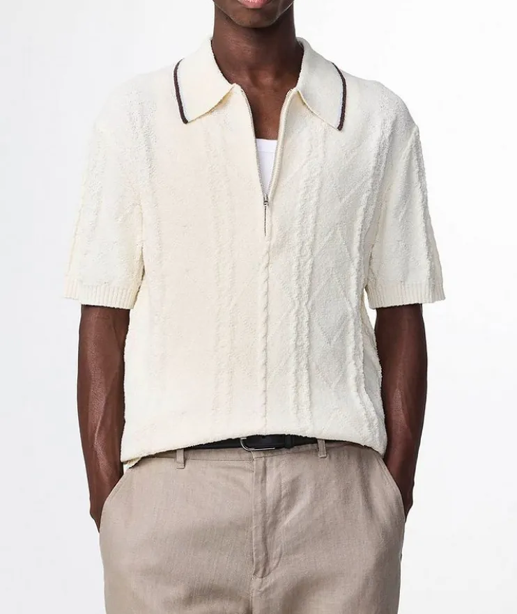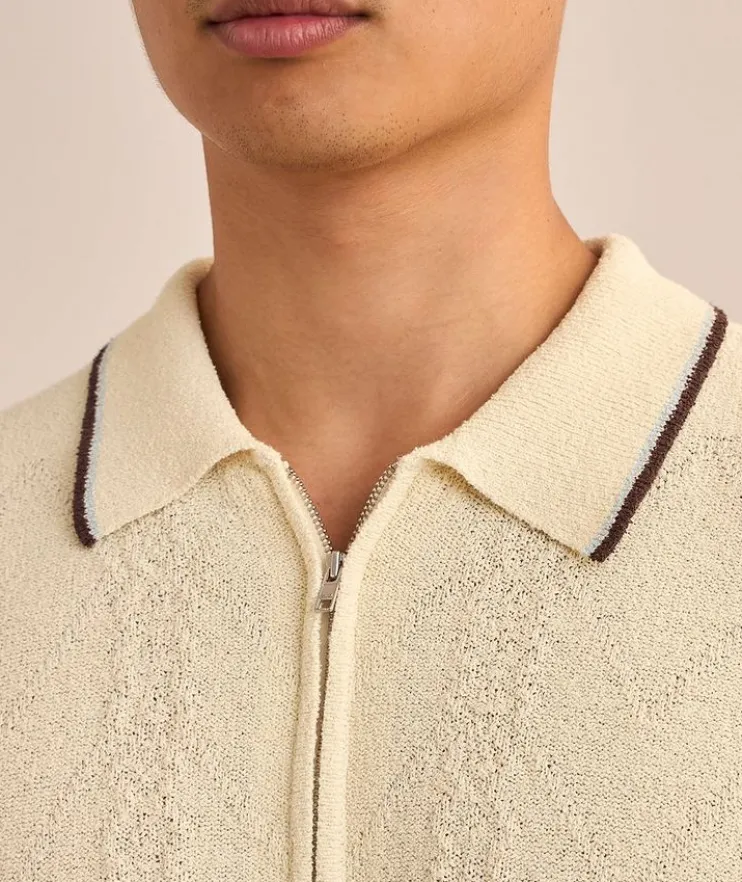 - Organic cotton polo designed with a classic collar, half-zip front and tonal textured argyle and cable knit finish. Contrast tipping at the collar lends a pop of colour to the refined style.