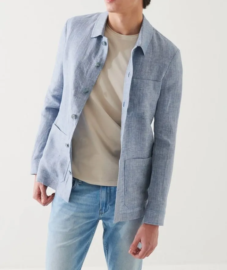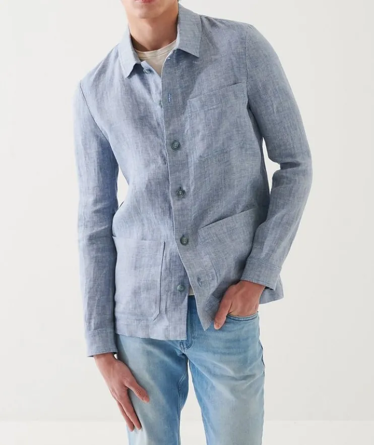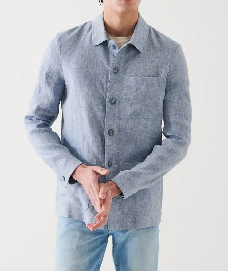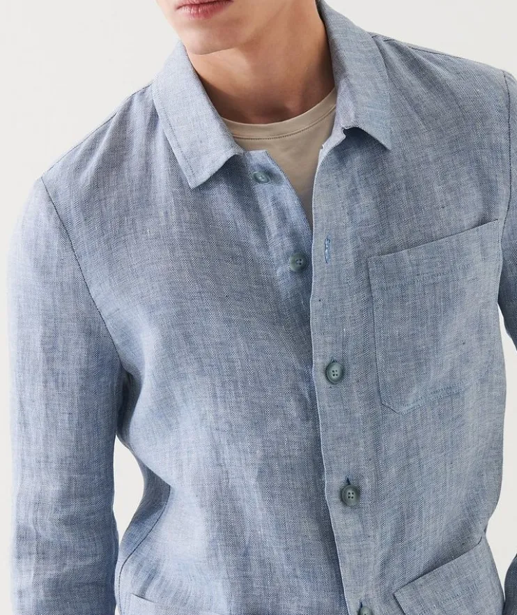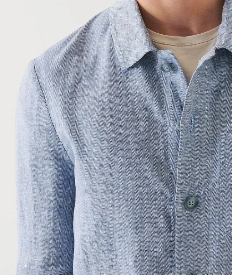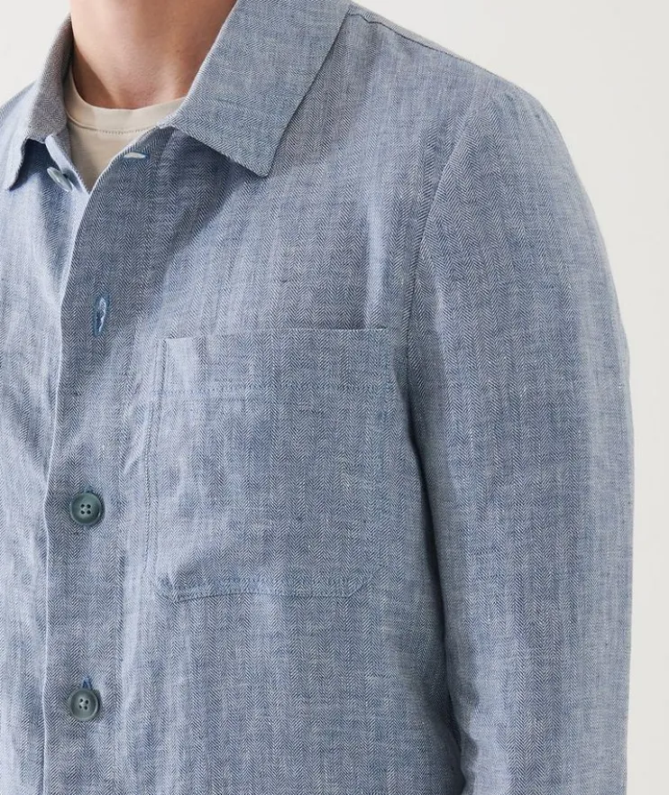 - Strike a perfect balance between tailored and casual with this functional shirt jacket. Expertly crafted in Italy from lightweight, breathable linen, this warm weather topper features a button front closure and patch pockets with a classic herringbone finish.