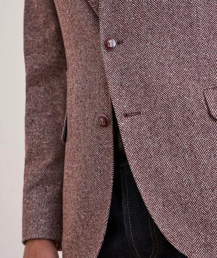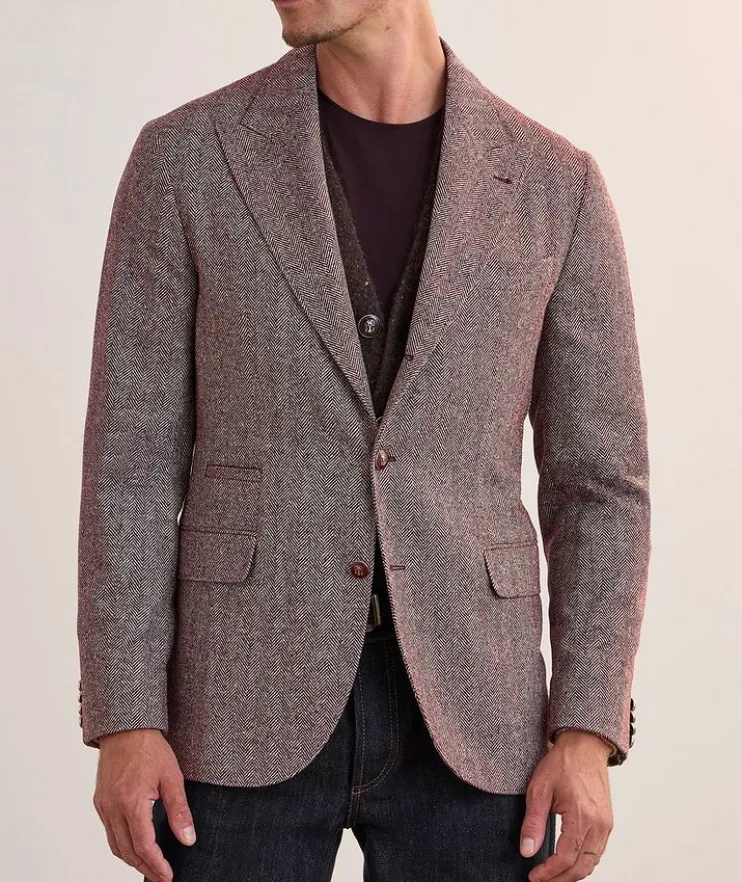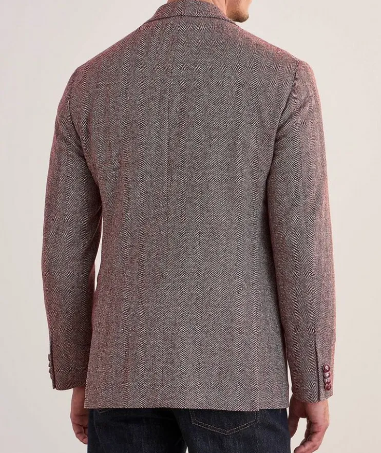 Expertly crafted in Italy from a luxurious virgin wool and cashmere blend, this soft tailored sport jacket is decorated with a classic peak lapel, three-button silhouette and allover herringbone finish.