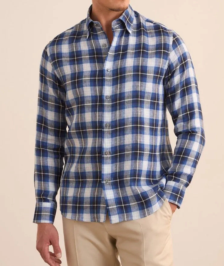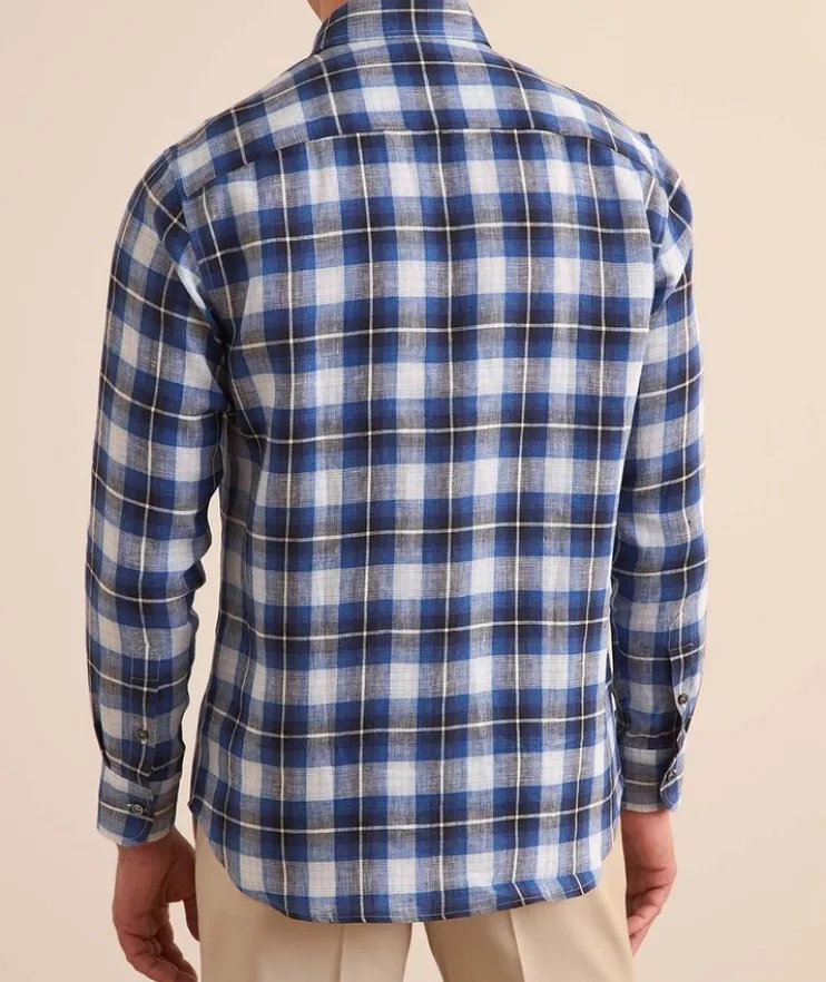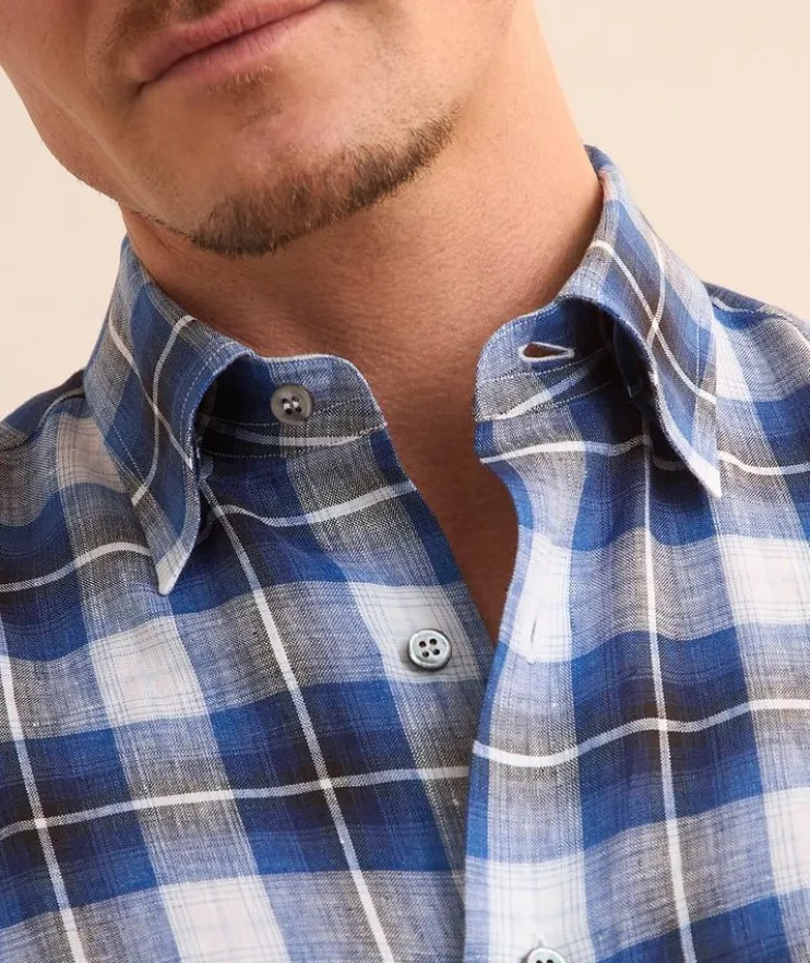 - Constructed in a solid design from breathable linen, this classic shirt is designed with hidden buttons at the collar to keep everything in place while simultaneously achieving a streamlined look.