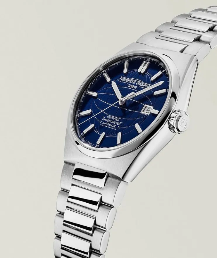 - Blue dial with globe pattern embossed in the centre