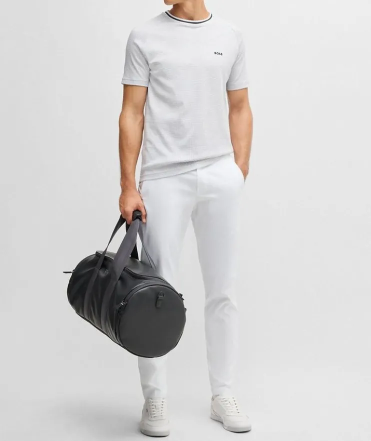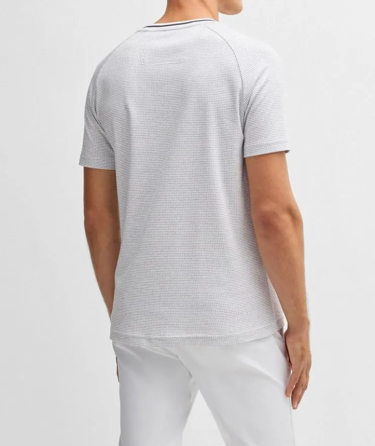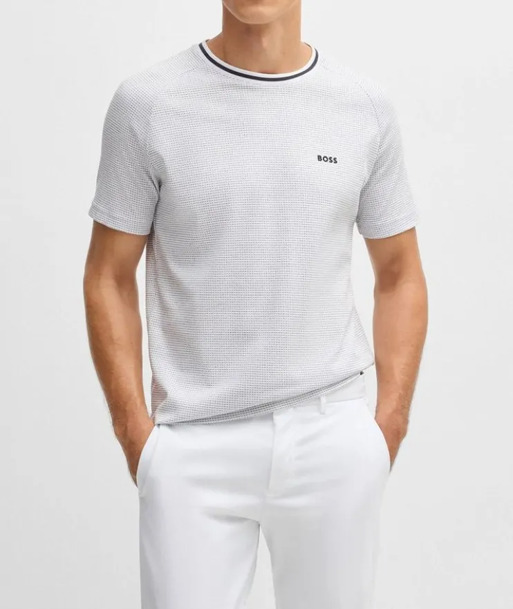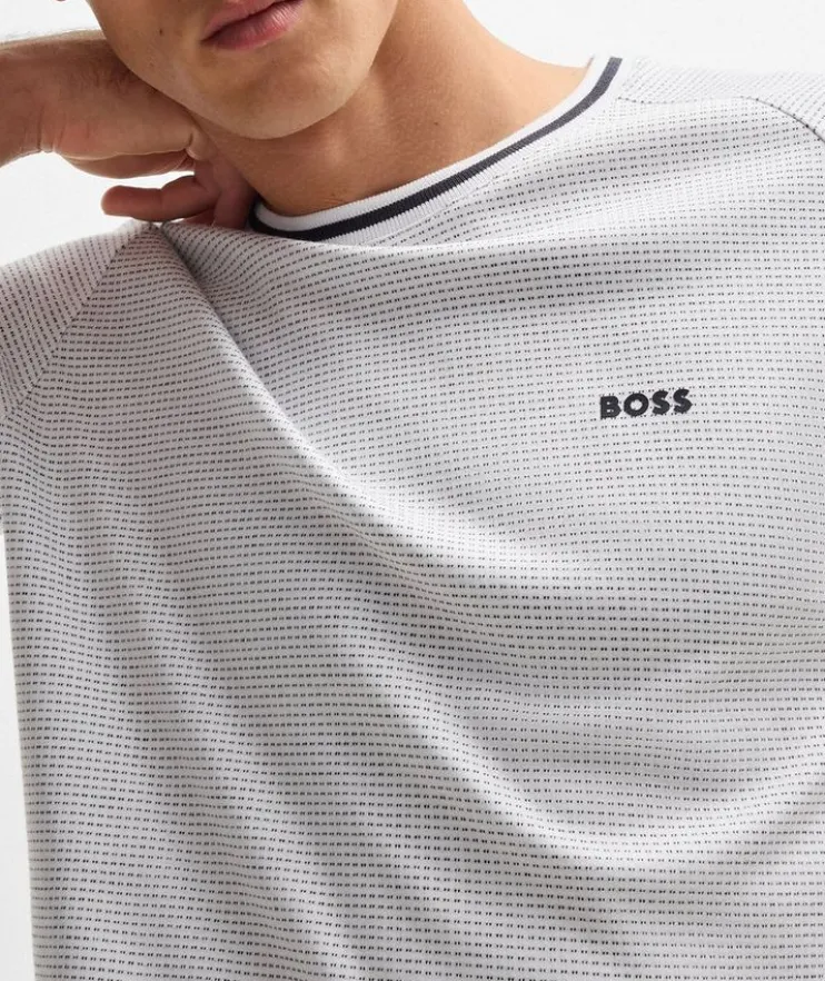 - A signature T-shirt with a logo detail by BOSS Menswear. This top is cut to a straight fit in cotton with a jacquard structure.