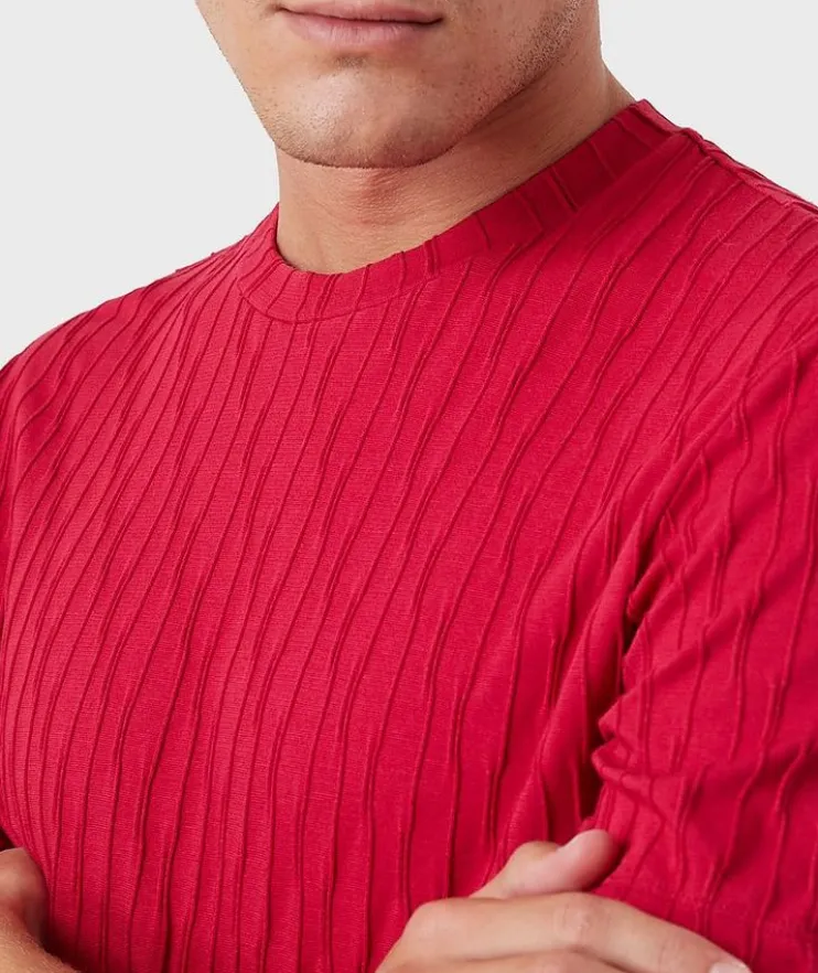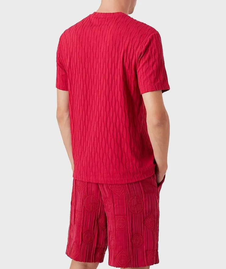- This elevated basic from Giorgio Armani is a sumptuous must-have for your daily rotation. Made from a stretch-cashmere blend, this unique short-sleeved t-shirt is defined by a comfortable fit. It is enhanced by a delicate, embossed wavy motif for added movement, making it perfect in a wide array of daytime looks.