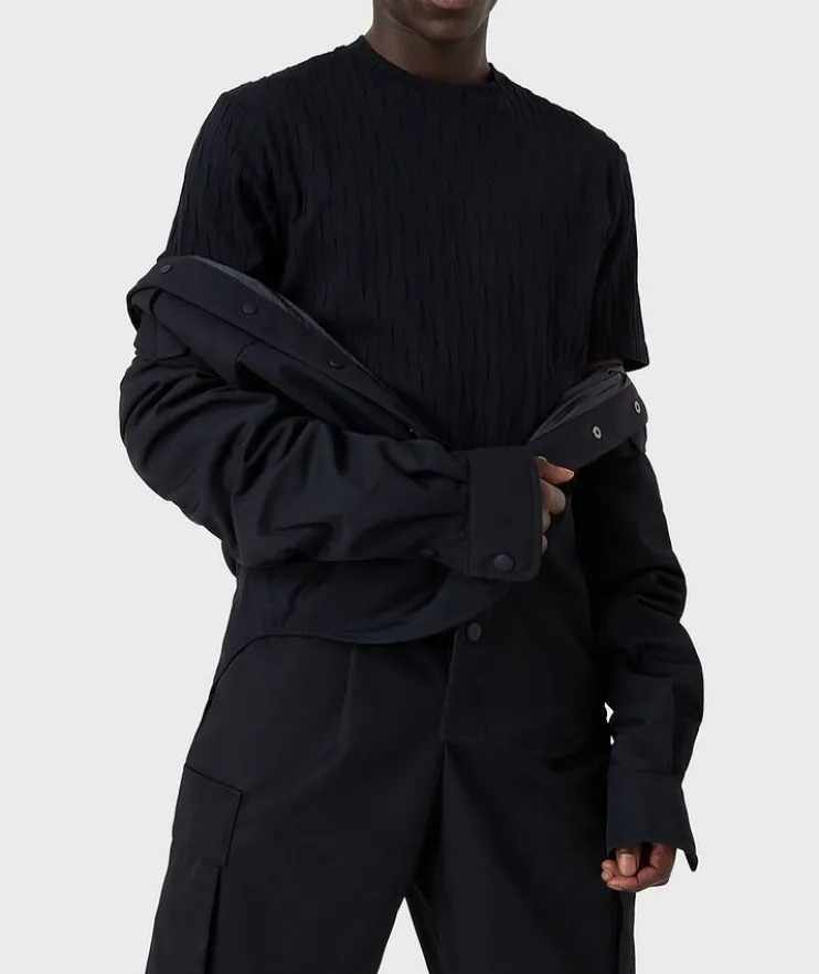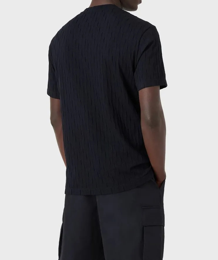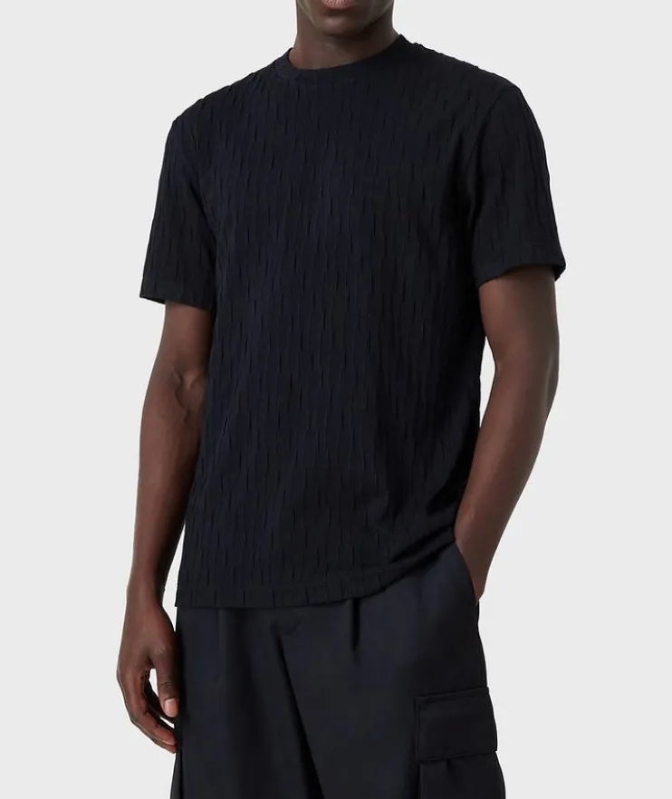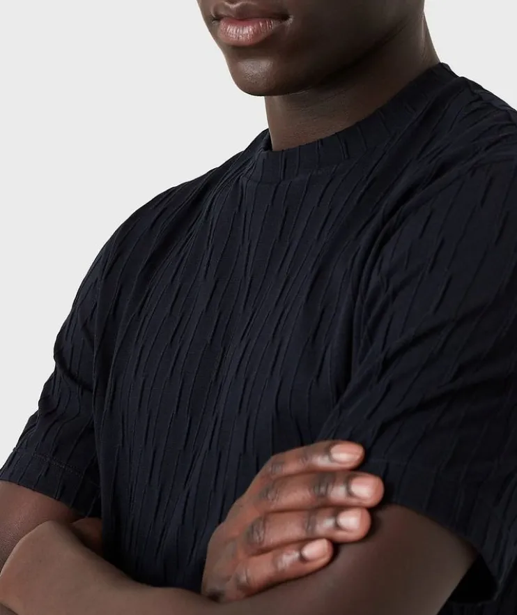 - This elevated basic from Giorgio Armani is a sumptuous must-have for your daily rotation. Made from a stretch-cashmere blend, this unique short-sleeved t-shirt is defined by a comfortable fit. It is enhanced by a delicate, embossed wavy motif for added movement, making it perfect in a wide array of daytime looks.