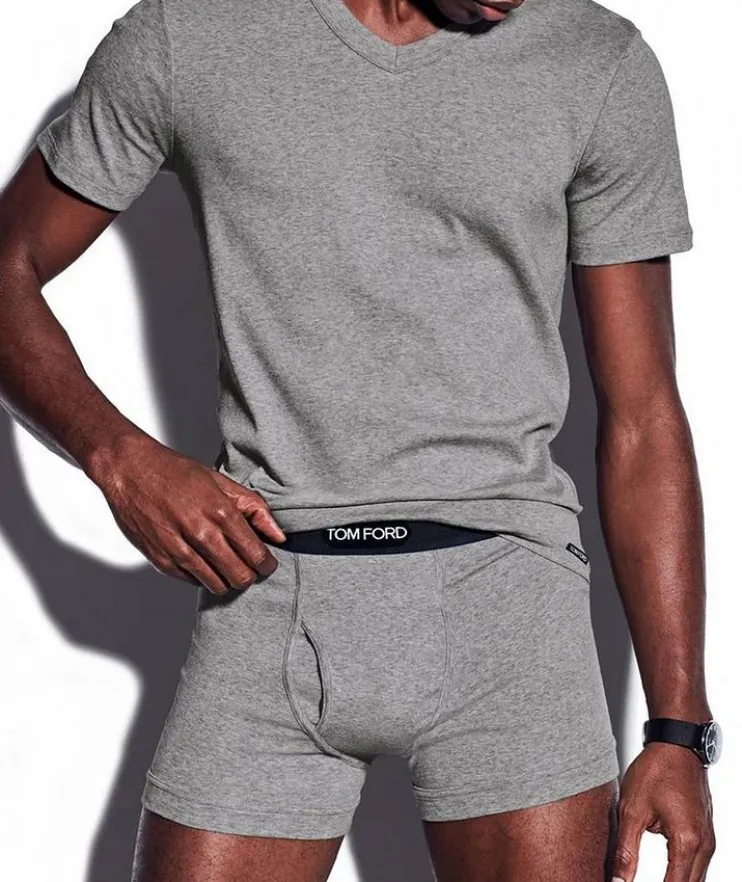 - Keep your undershirt collection at its best with this jersey tee from TOM FORD. Crafted from stretchy cotton-modal, this v-neck t-shirt dons a grey melange finish and a logo tab on the hem. With a fresh tee like this one, never make compromises to your personal style; even while you’re wearing the least.