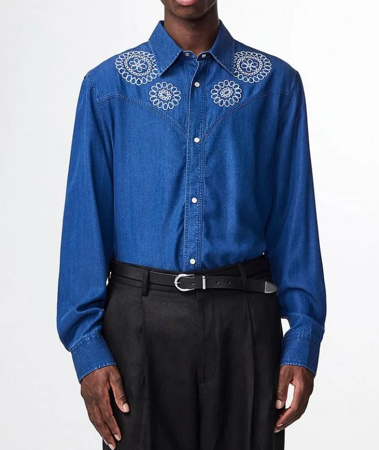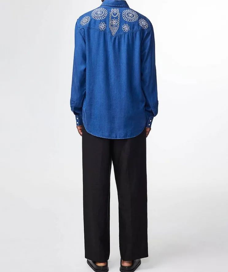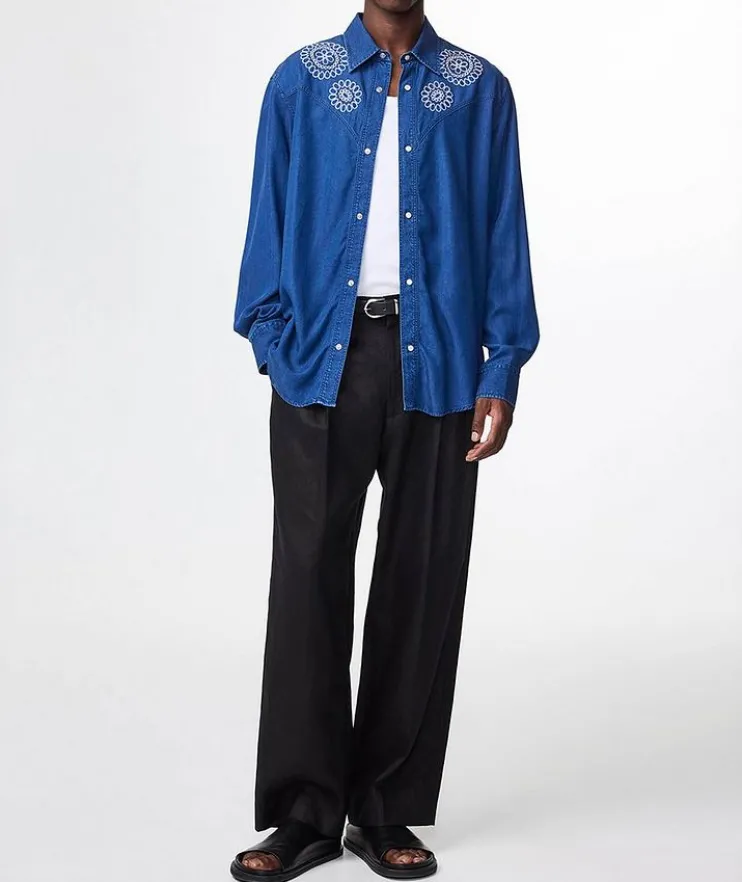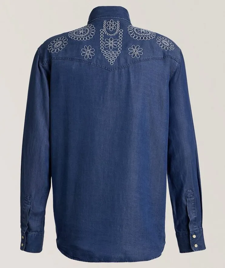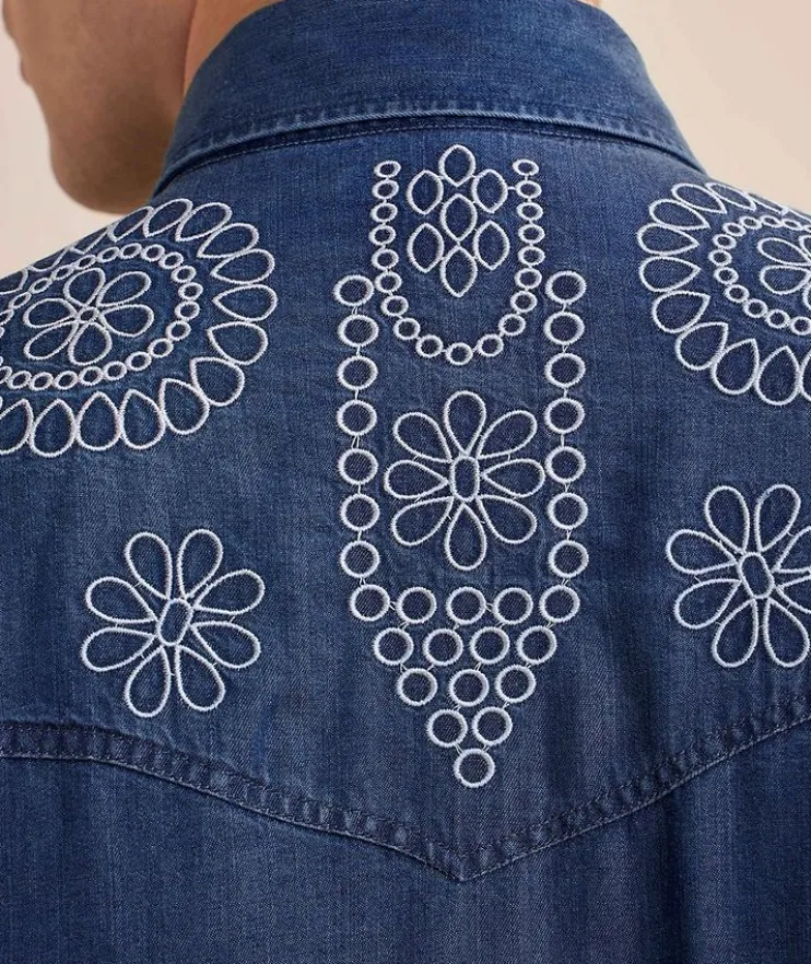 - Crafted from a lightweight TENCEL™ Lyocell fabric twill, this Western-inspired shirt is presented with snap press buttons and embroidered floral detail at the chest and back yoke.