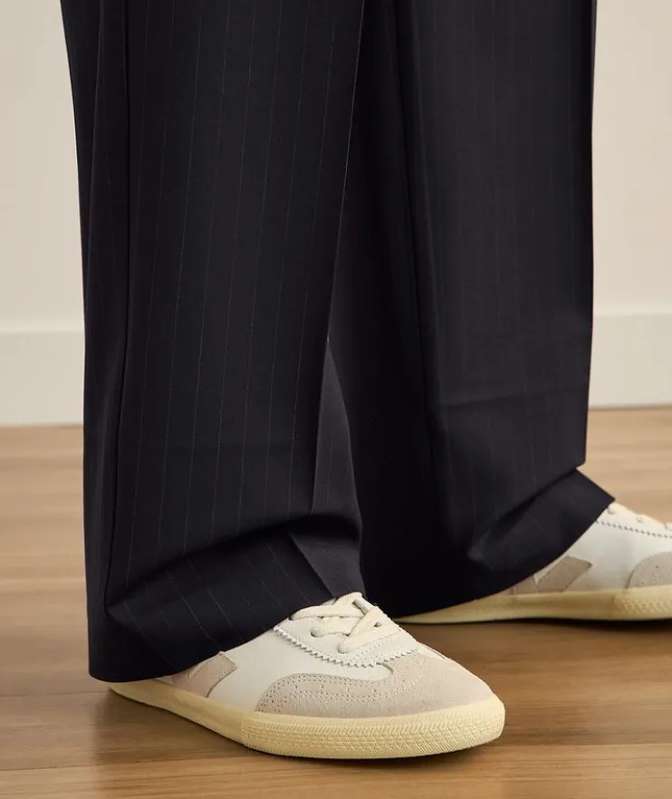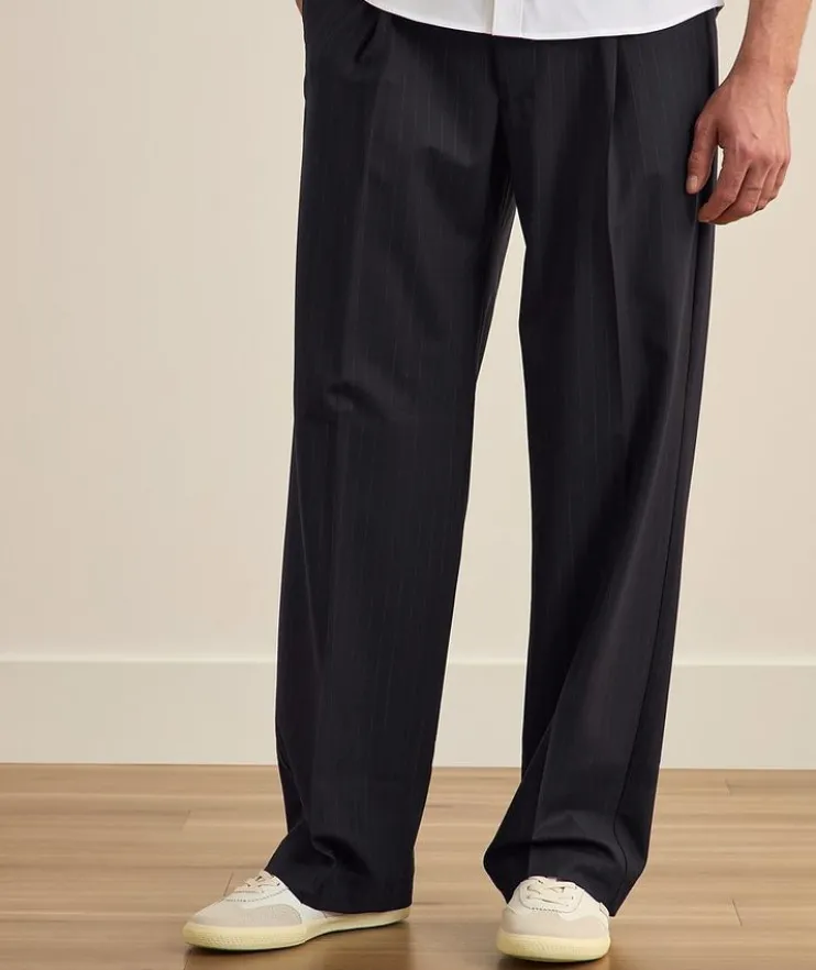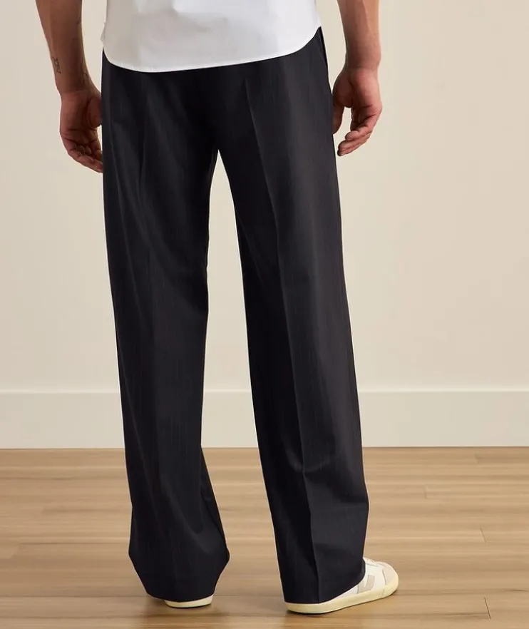 - On-trend wide leg trousers are crafted in drapey pinstriped recycled polyester and responsible wool-blend fabric with a touch of stretch and finished with an elasticized waist for extra comfort.