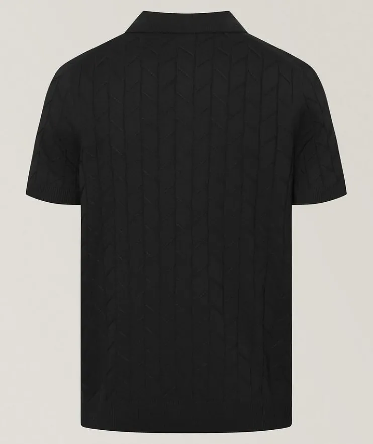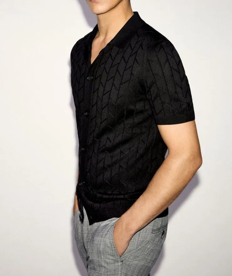 - This short sleeve shirt is crafted in a cable knit design with tonal button details for a streamlined, contemporary look.