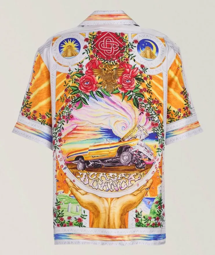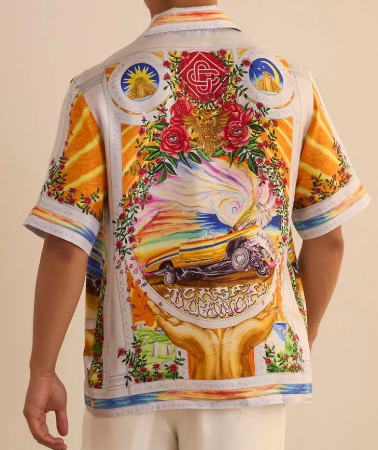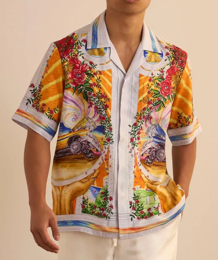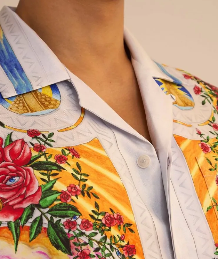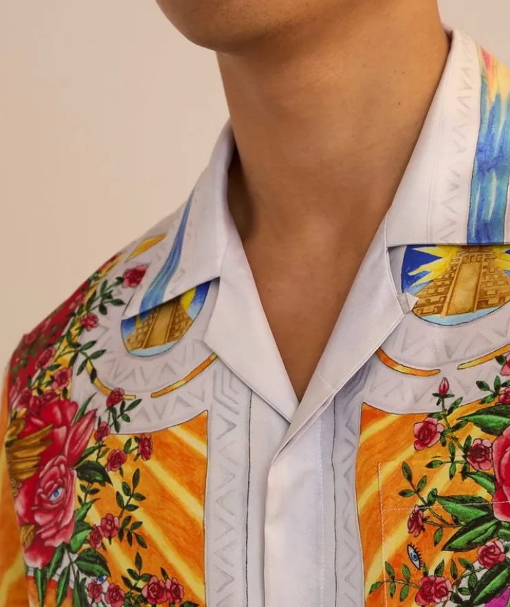- Cut from smooth, luxurious silk and enriched with a painterly print inspired by Mexican American art, this short-sleeved shirt makes for an elegant statement piece for the modern gentleman.