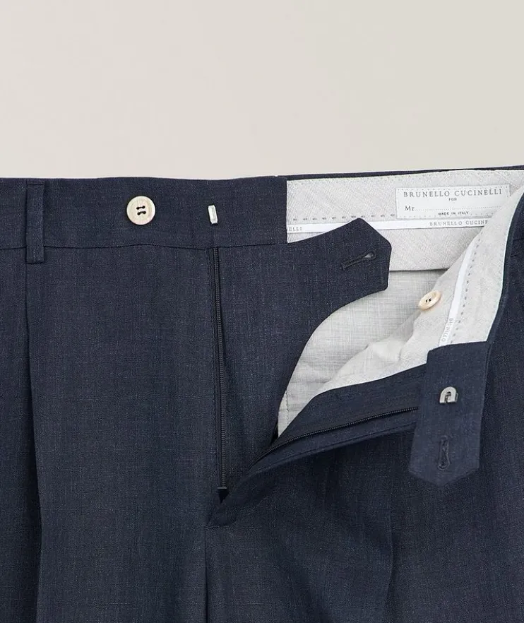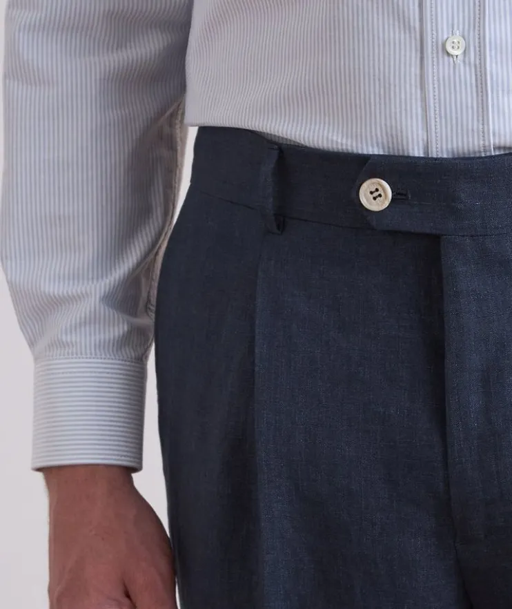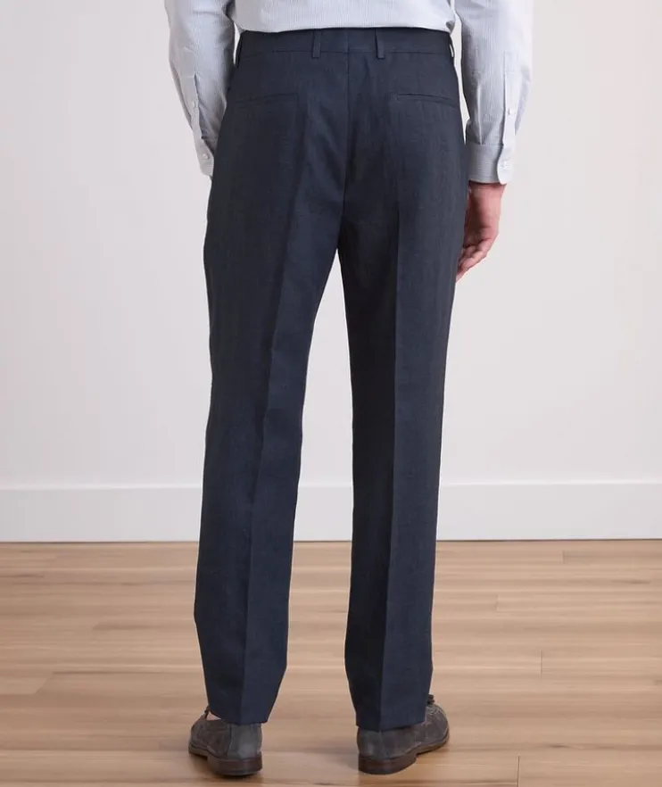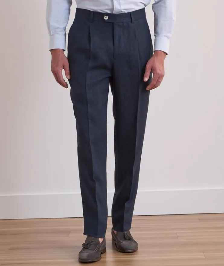 - Classic and comfortable, these linen trousers are tailored with single pleats in a modern leisure fit, combining a relaxed cut in the hips with a slight low-rise and tapered leg. The hems of this garment are unfinished. Alterations are needed to adjust the leg length.