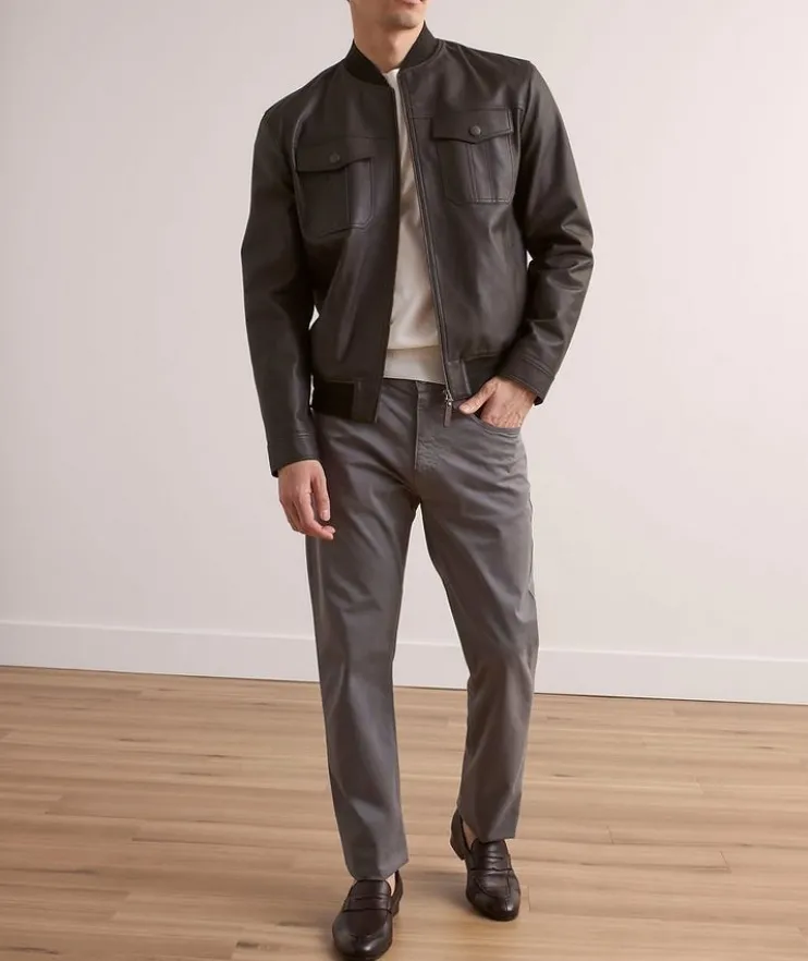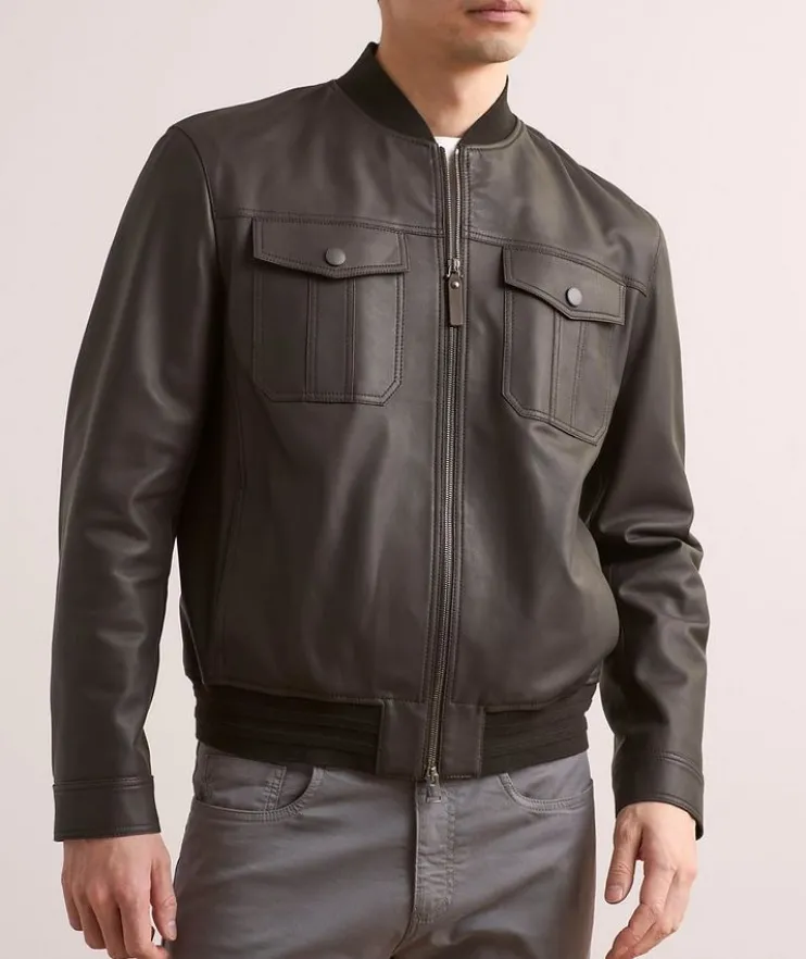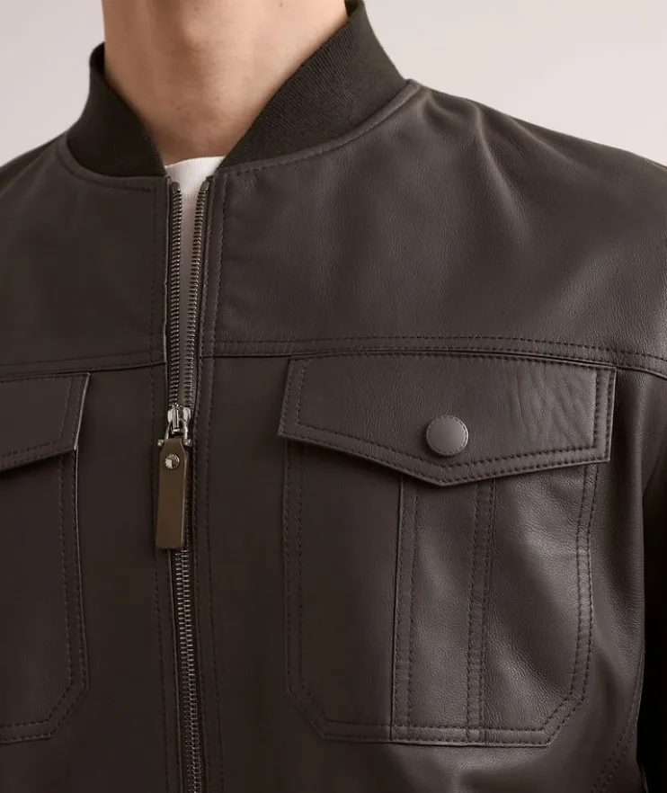 - A timeless appeal characterizes this luxurious leather bomber. The iconic design, with a practical two-way zip and knitted hem also stands out with its upper patch pockets and satin lining.