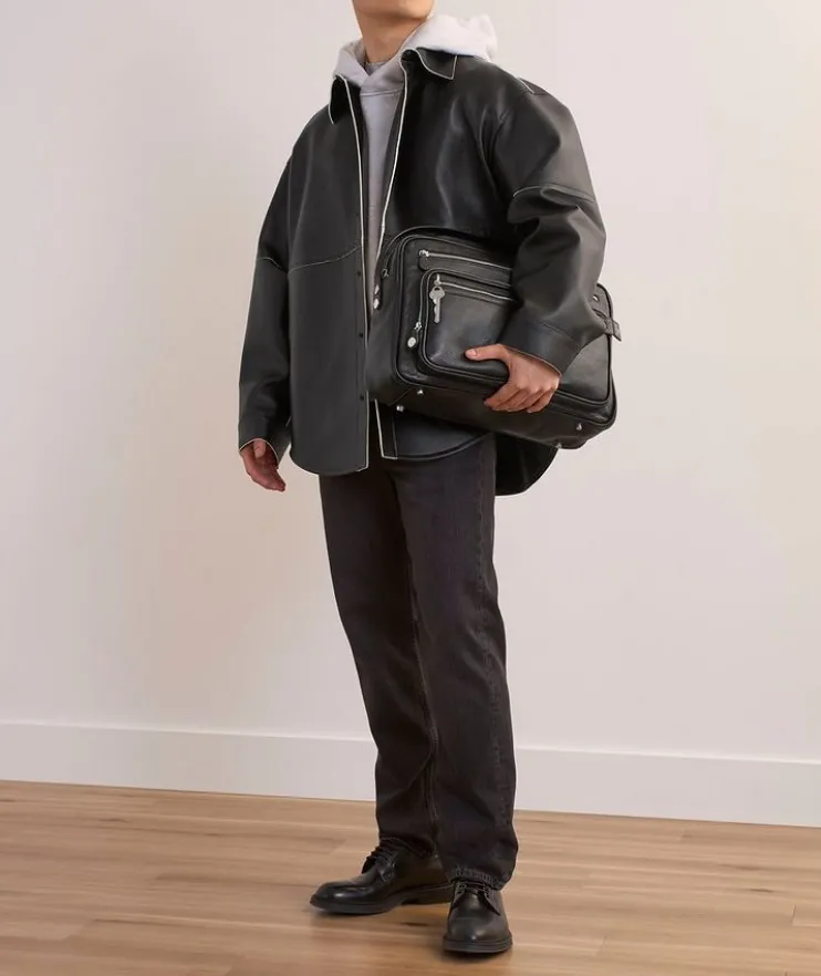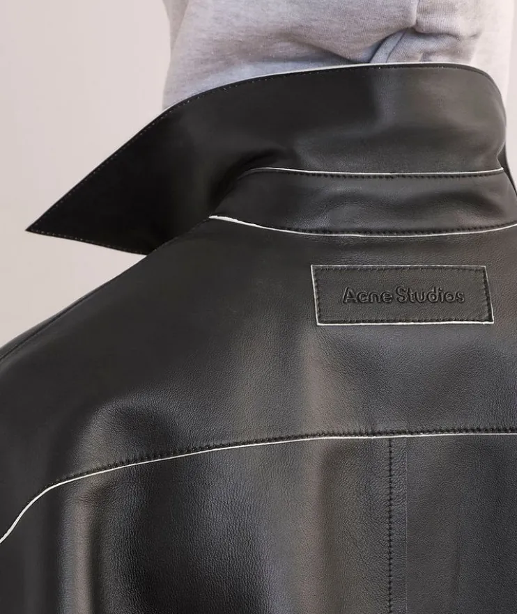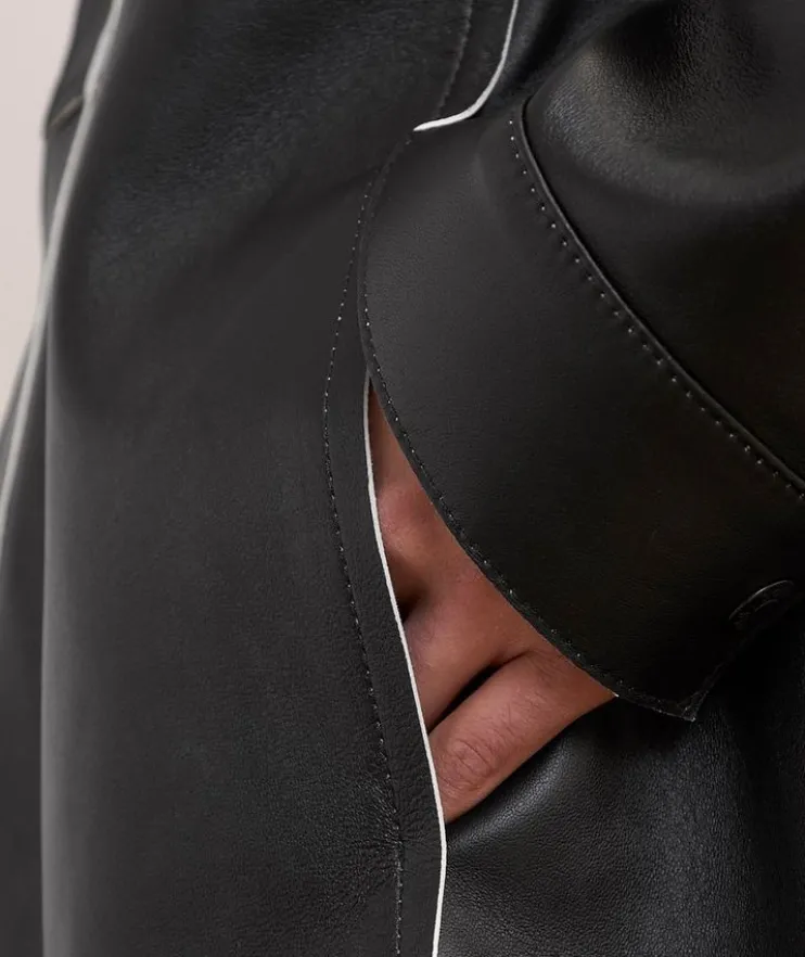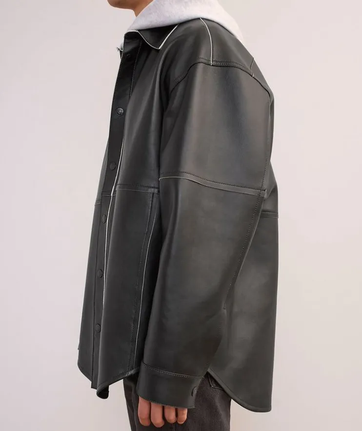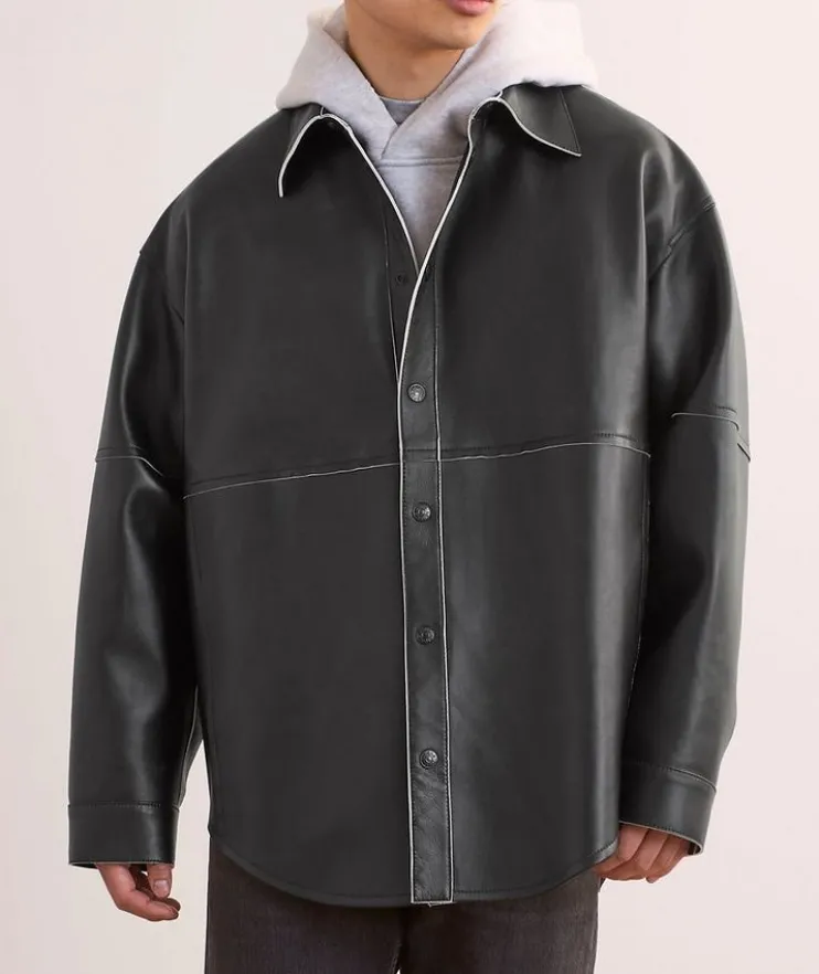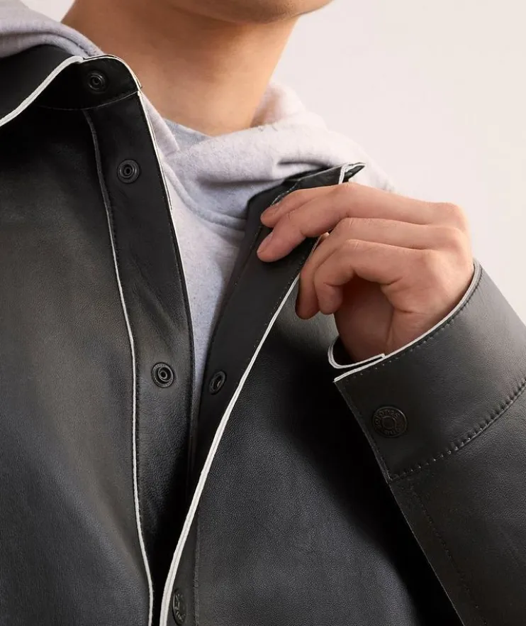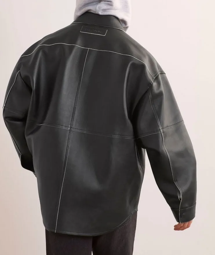 - Crafted from lamb leather, this shirt jacket is cut to a relaxed fit and detailed with piping trim and the brand’s embossed logo patch on the back.