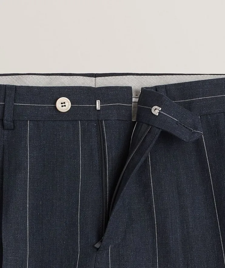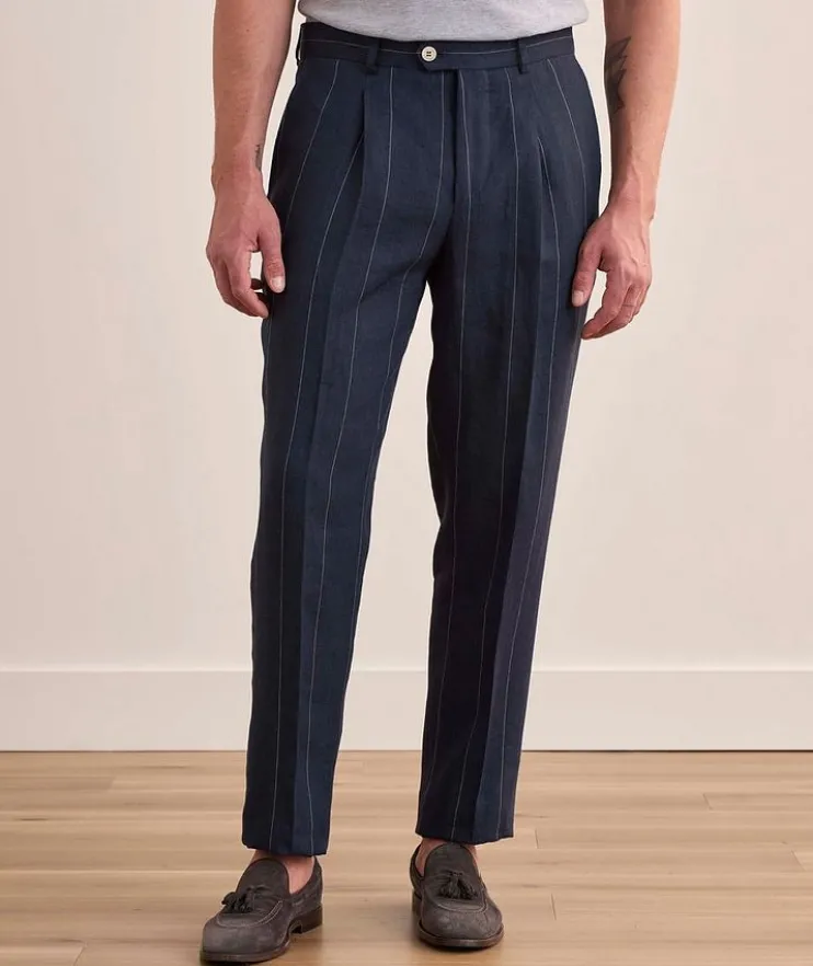 - Classic and comfortable, these pinstripe suit pants with are tailored with single pleats in a modern leisure fit, combining a relaxed cut in the hips with a slight low-rise and tapered leg. The hems of this garment are unfinished. Alterations are needed to adjust the leg length.