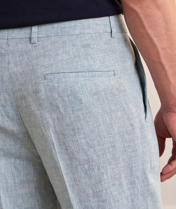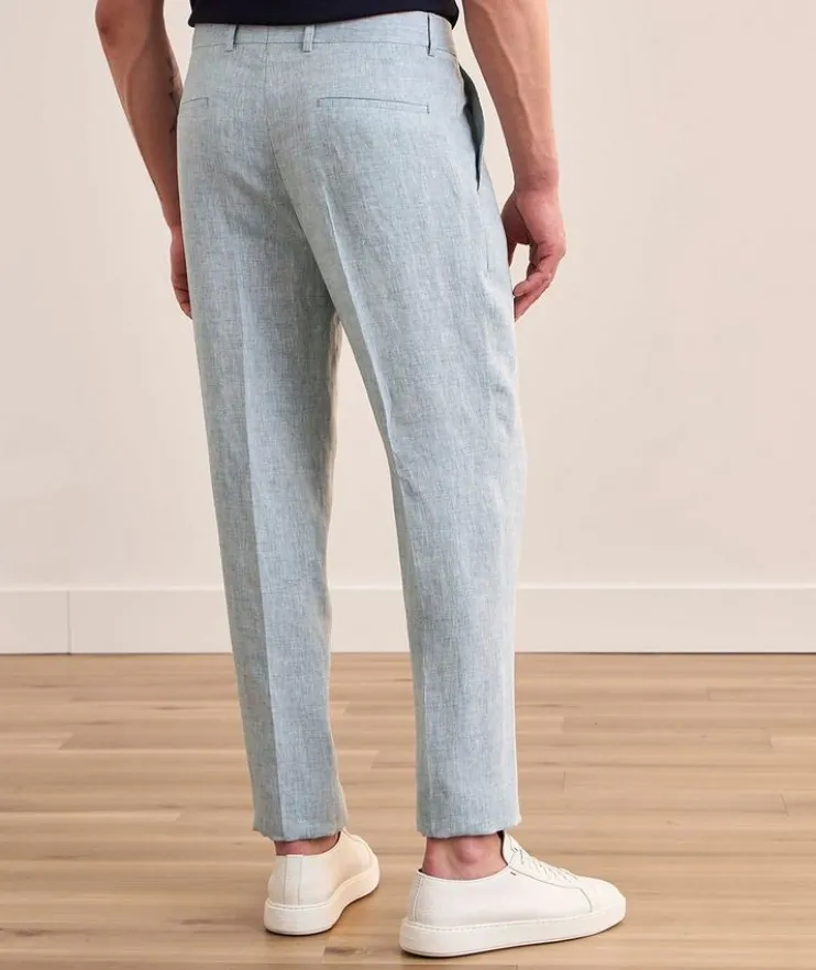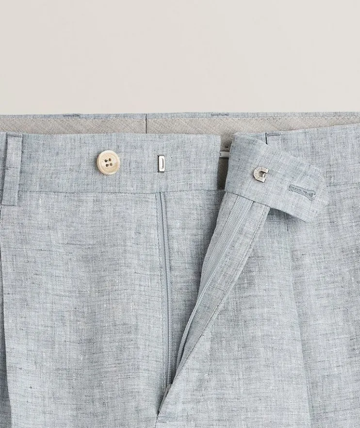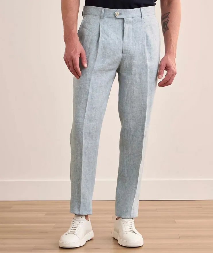 - Classic and comfortable, these linen suit pants are tailored with single pleats in a modern leisure fit, combining a relaxed cut in the hips with a slight low-rise and tapered leg. The hems of this garment are unfinished. Alterations are needed to adjust the leg length.