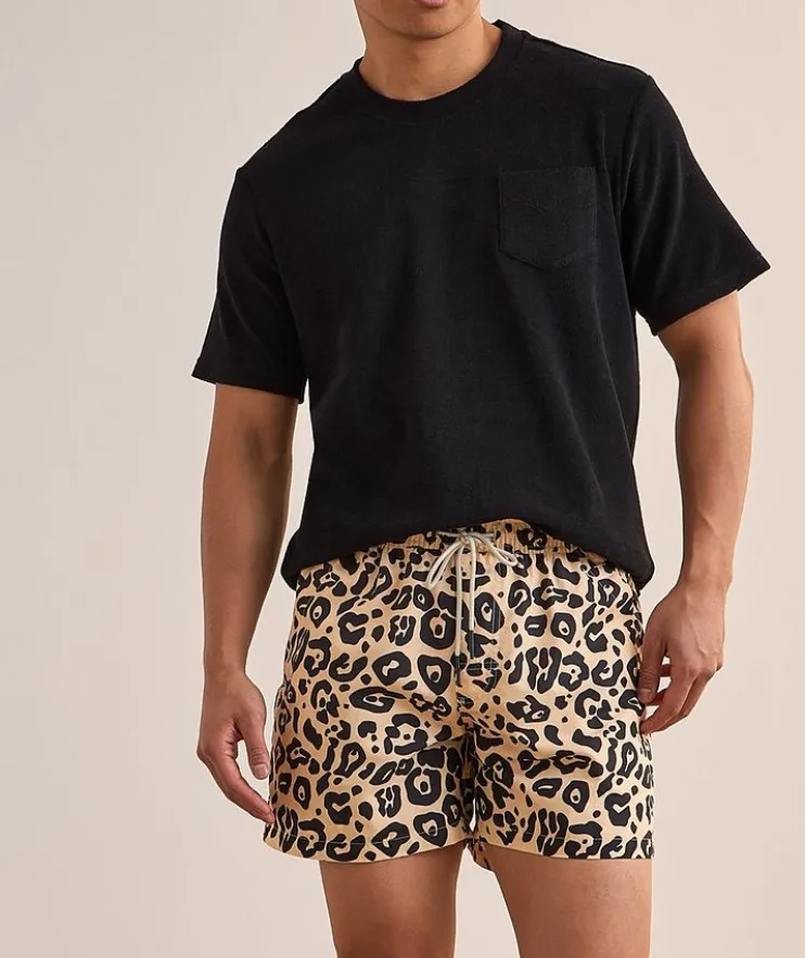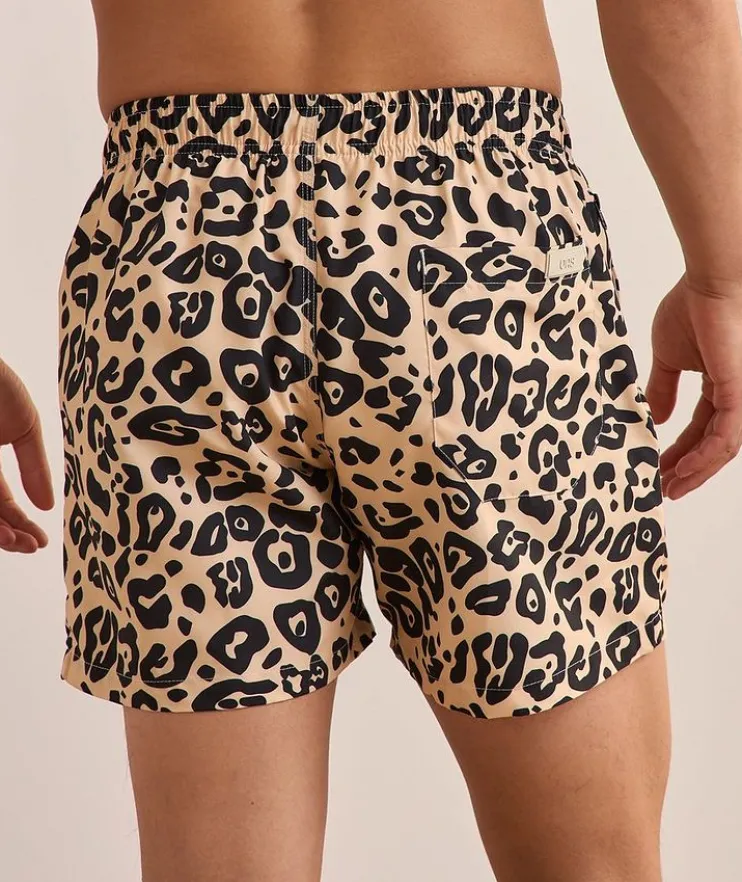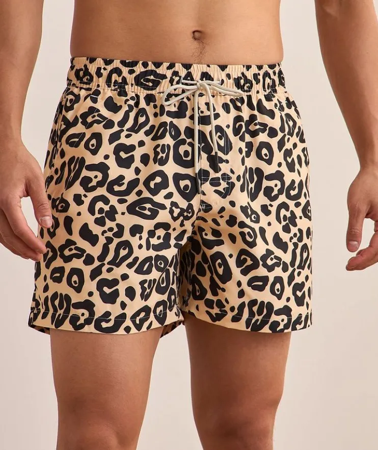 - An attention-grabbing leopard print takes centre stage on these quick-drying swim shorts. Tailored in a relaxed, straight fit with multiple pockets, these shorts feature built-in mesh briefs for comfort and support.