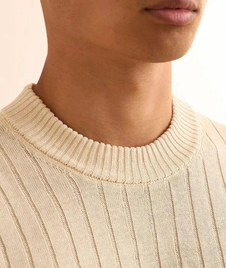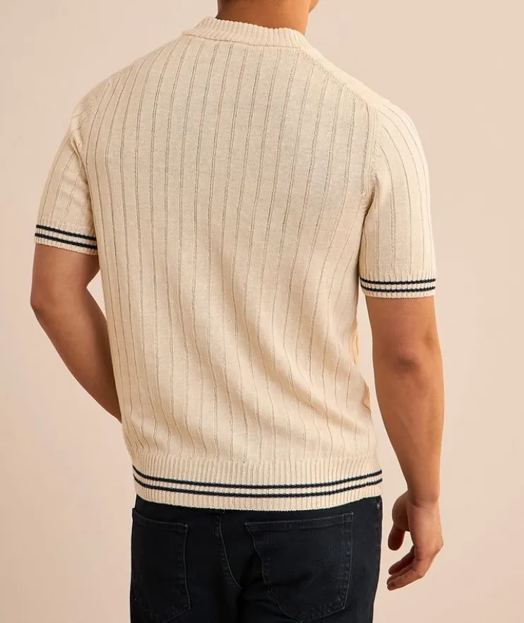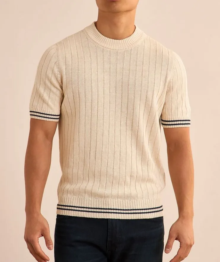- Crafted from a linen and cotton blend in a refined fit with striped trim and a ribbed finish, this short-sleeved cricket-style sweater lends an old-school varsity aesthetic to everyday styling.
