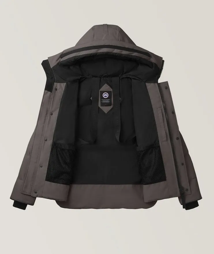 - This wool-blend MacMillan parka from Canada Goose is a city-inspired take on the renowned style. Ready for any condition, the 625 Fill Power white duck down hooded jacket is designed to softly envelop you with warmth — it’s detailed with a curved hemline, recessed knit cuffs, and the brand’s black disc to ensure a modern look apt for urban dressing.