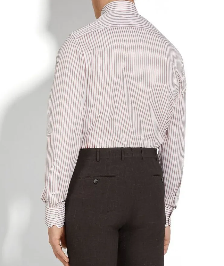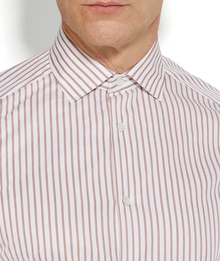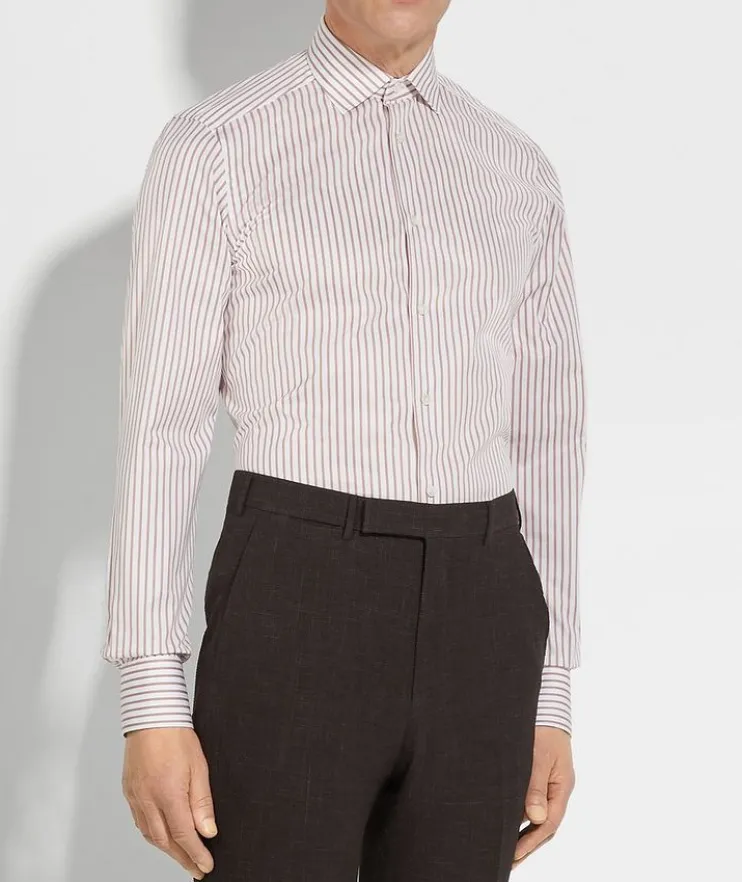 - This structured dress shirt is naturally resilient with a smooth finish thanks to its very fine, triple-twisted Trecapi cotton fibers. Enhanced with an elegant macro-striped pattern, this elevated wardrobe staple is styled with a rounded hem, semi-spread collar and classic button-front silhouette.