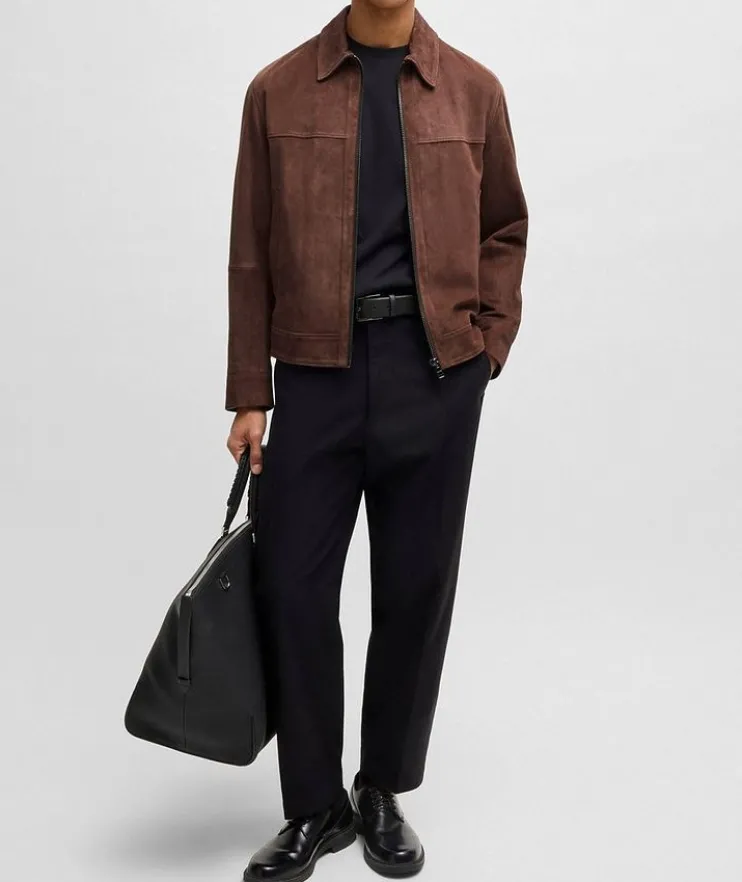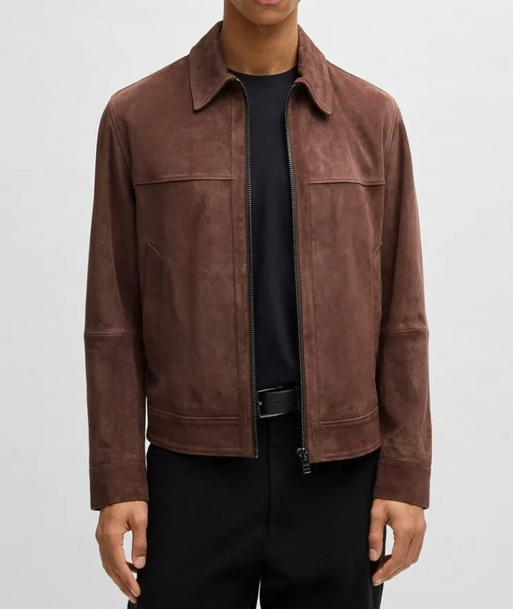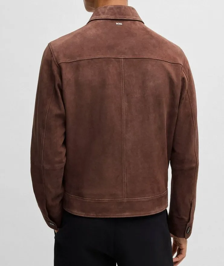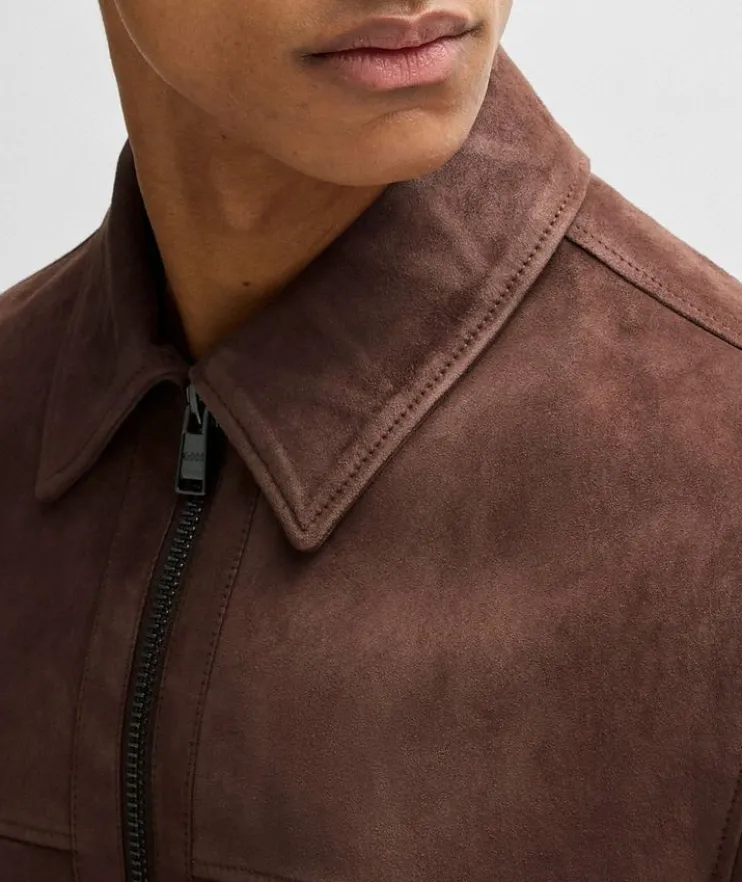 - Crafted from soft suede with a smooth lining for added comfort, this sleek jacket features a regular straight fit to create a flattering silhouette. A versatile styling piece in any outerwear collection.