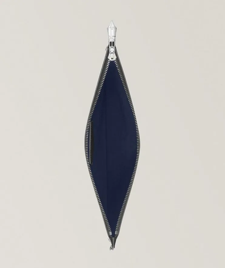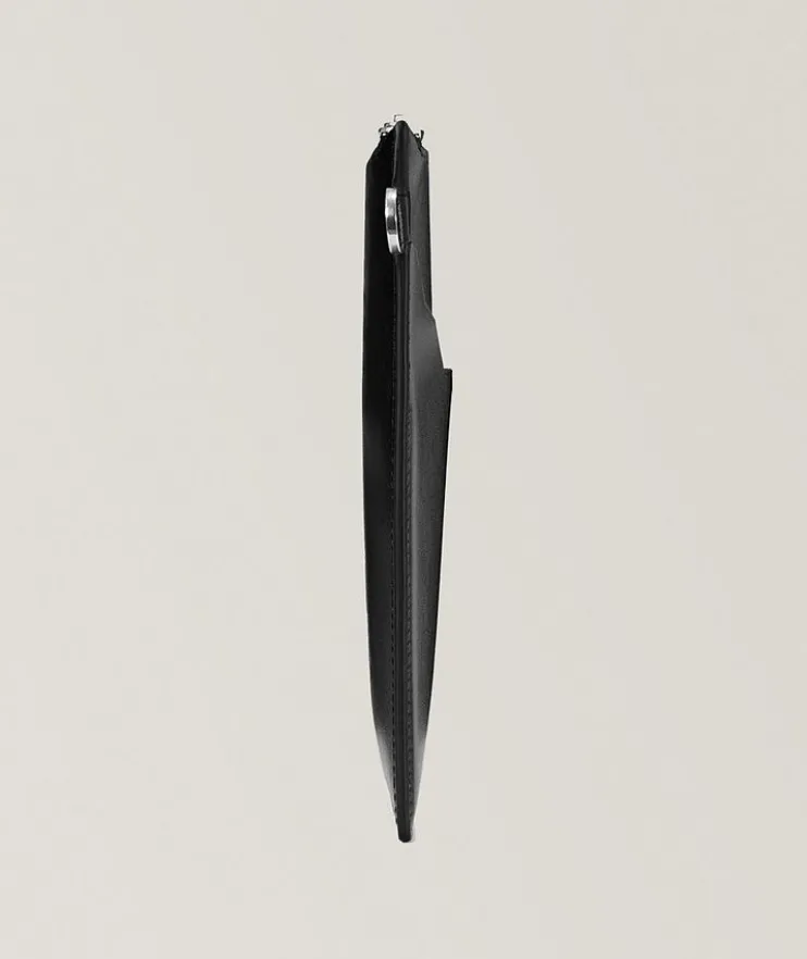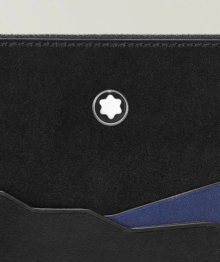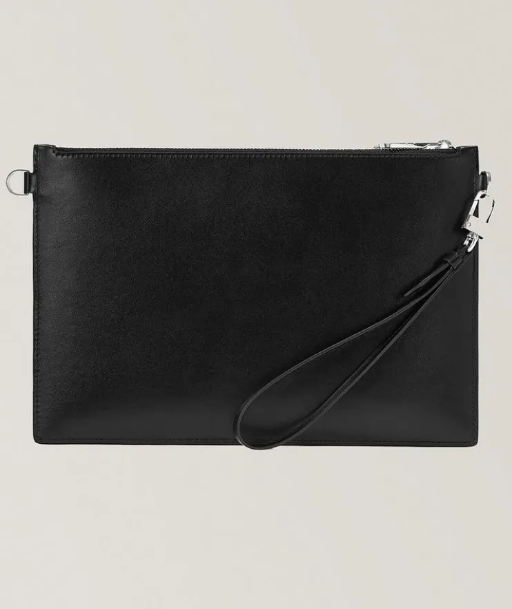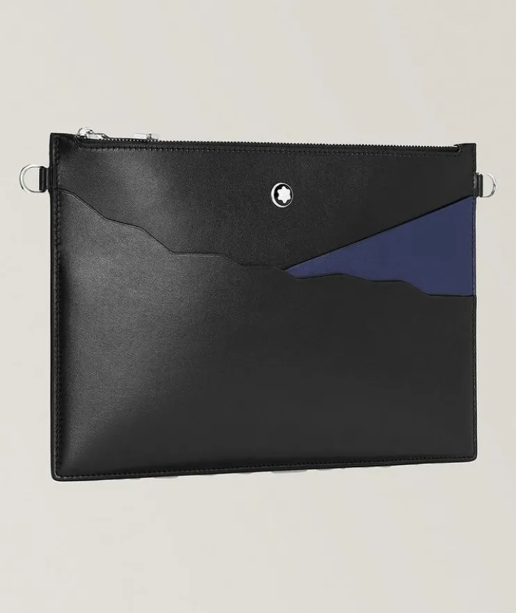 - Inspired by the writing culture, the Meisterstück Pouch is a stylish way to have everyday essentials at hand. Crafted from a new deep shine black leather, all its details speak the language of the nib: stitching, zip puller recall the shape of the nib, the essence of Montblanc. A bigger version of the logo lights up the bag. The outline of the front pocket is a tribute to the brand. To be carried under the arm, by hand, or looped around the wrist for an on-trend look. It integrates two D-rings for attaching a shoulder strap, sold separately, or accessories to add a personalized touch.