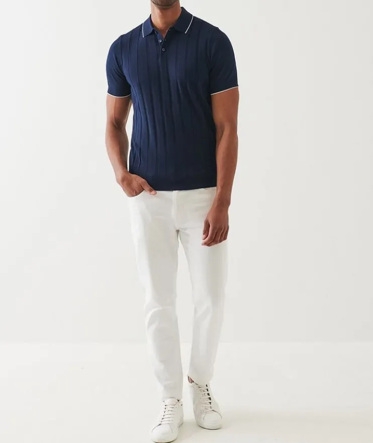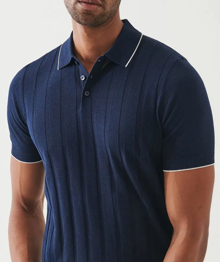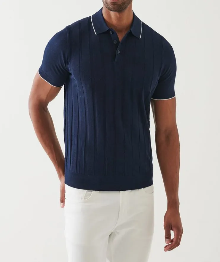 - Crafted from a luxurious combination of merino wool and silk, this polo offers softness and refined texture. The drop needle design adds depth and sophistication, making it a versatile choice for both refined casual and smart dressing.