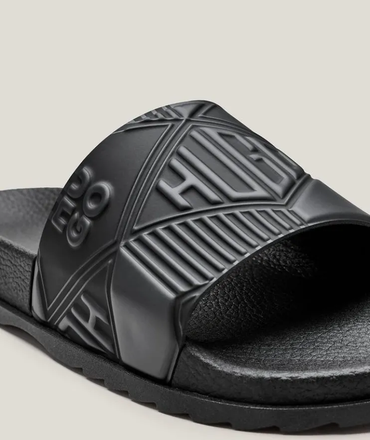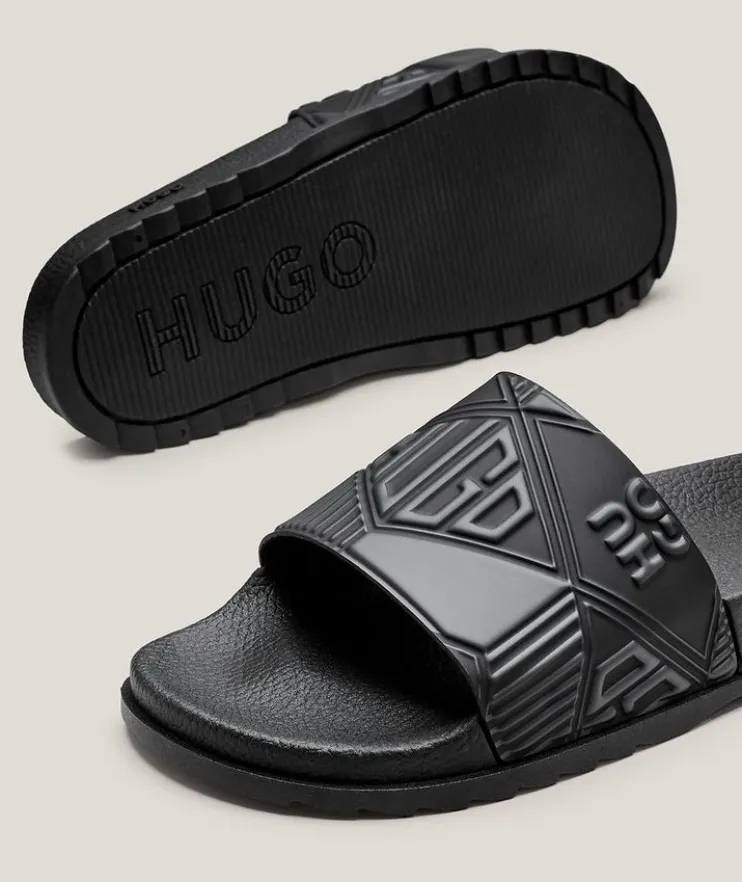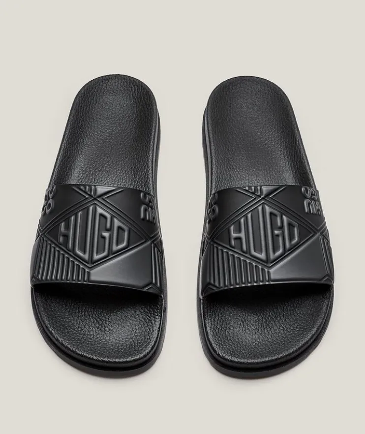 - These summery slide sandals showcase geometric and stacked logos for a contemporary look.