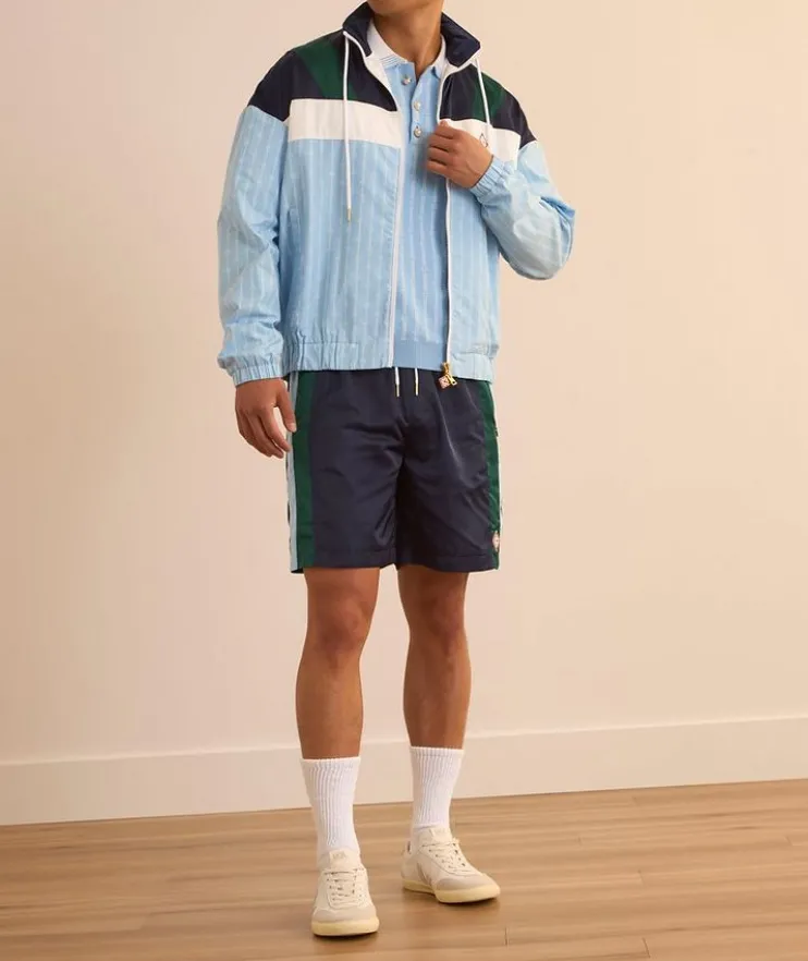 - Spread collar with contrasting trim and striped details