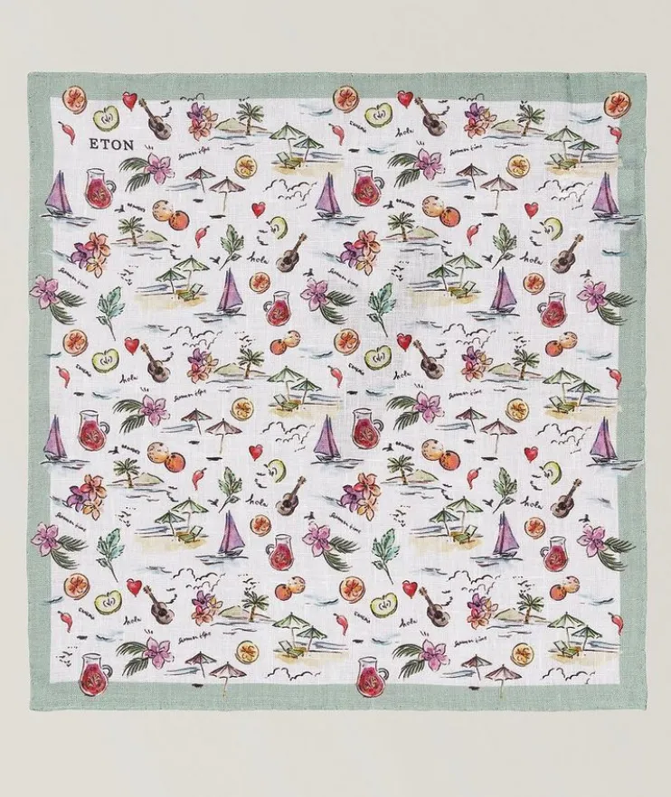 - Add a warm-weather detail to your tailoring with this 100% linen pocket square printed with a playful summer design featuring sangria, sail boats and sandy beaches. The pure linen fabric’s texture creates a relaxed aesthetic, while the summery print adds vacation vibes to your business edit.