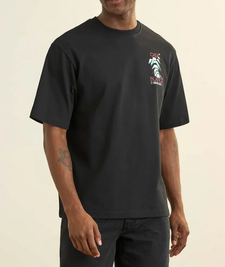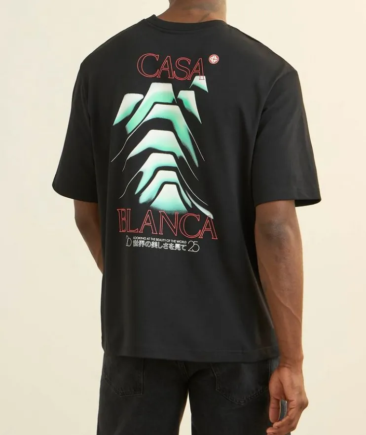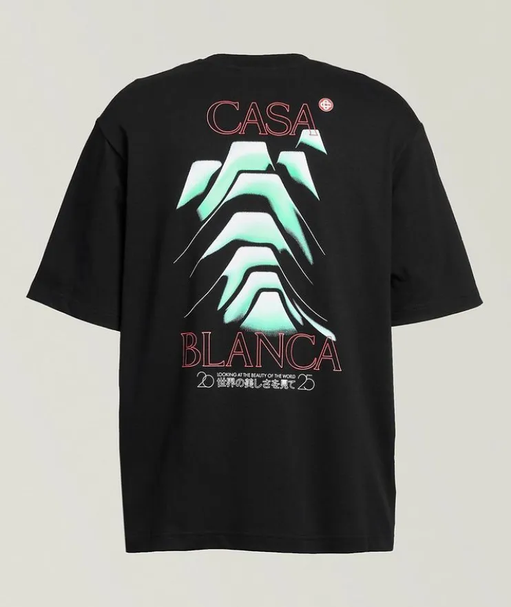 - A weekend styling essential, this laidback T-shirt features a mountain-inspired graphic print design from front to back. Finished with a classic crew neckline and organic cotton fabrication for a comfortable wear.