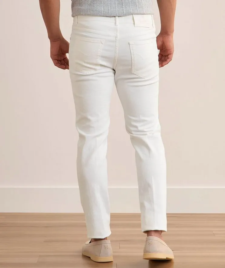 - Designed for a man on the go, these slim-fit jeans are crafted from a cotton and linen denim blend with slight stretch for added comfort and feature subtle logo details for a refined look.