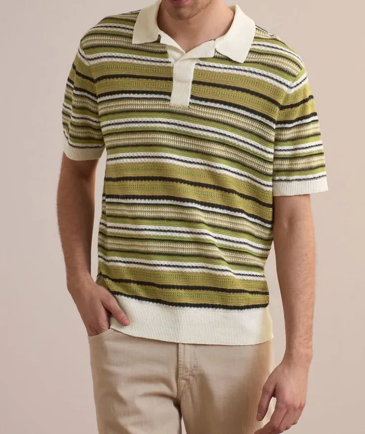 - Seasonal stripes enhance this knitted polo made in a comfortable drapey linen fabric and finished with an open collar and ribbed detail along the cuffs and bottom hem.