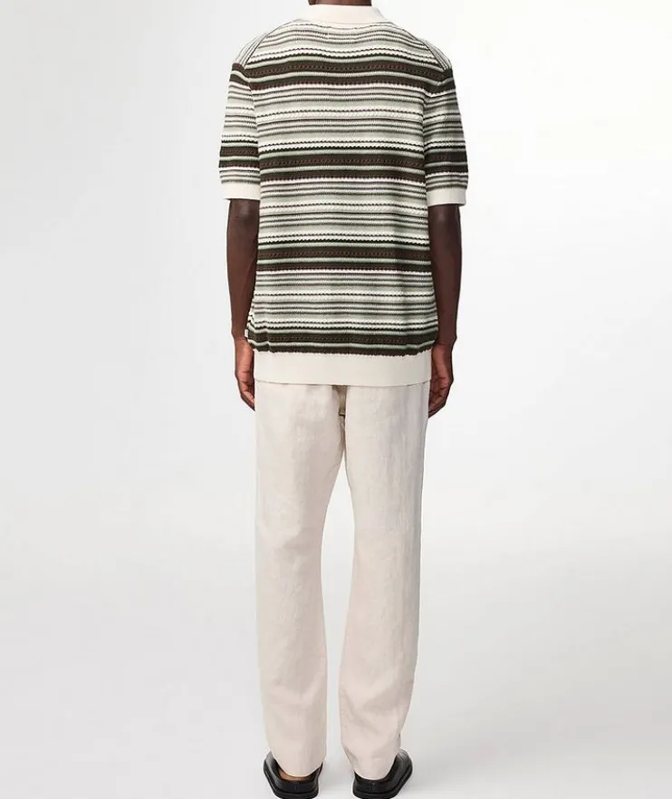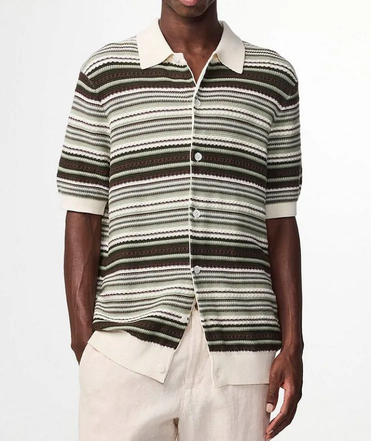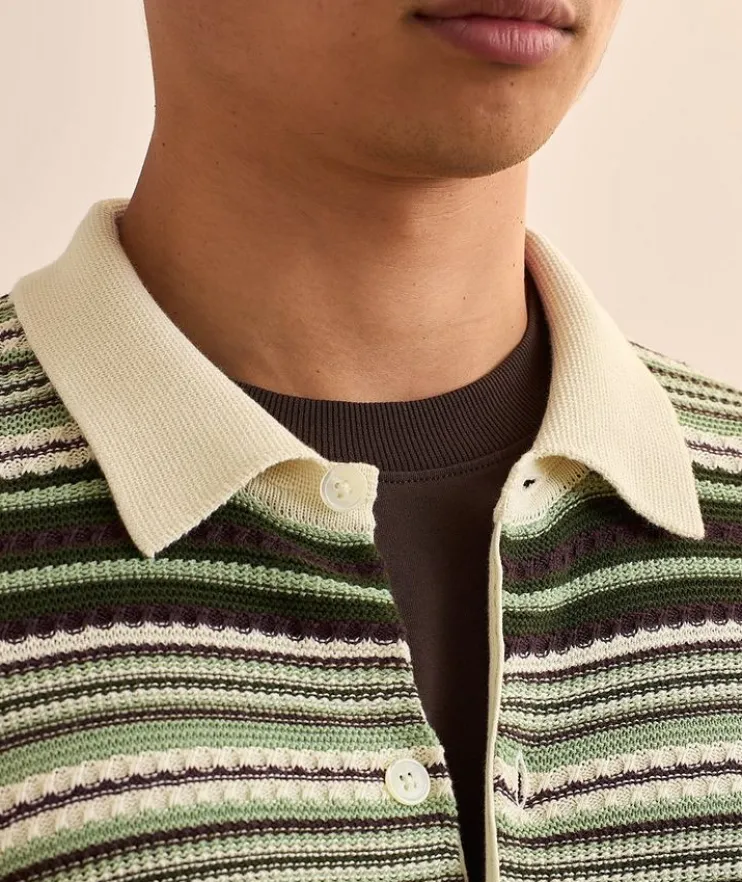 - Unearth your ideal wardrobe with this eye-catching cardigan designed in organic cotton with a polo collar, button front and textured multi-stripe finish. Soft ribbed knit edges and Mother-of-pearl buttons lend traditional elements to the garments simple, clean style.