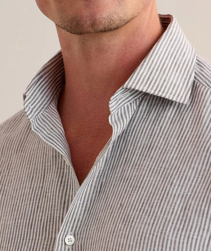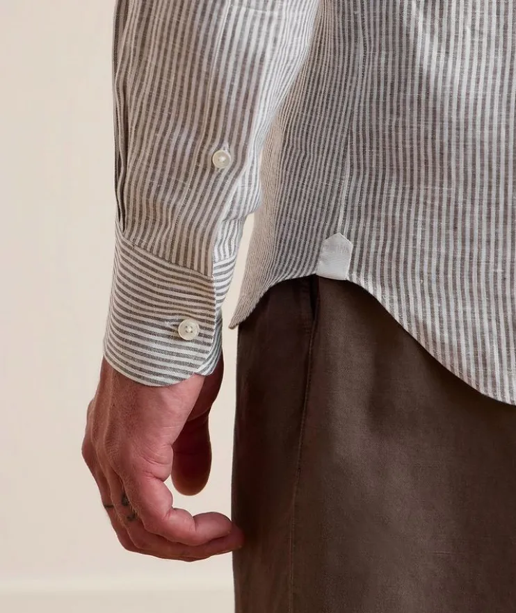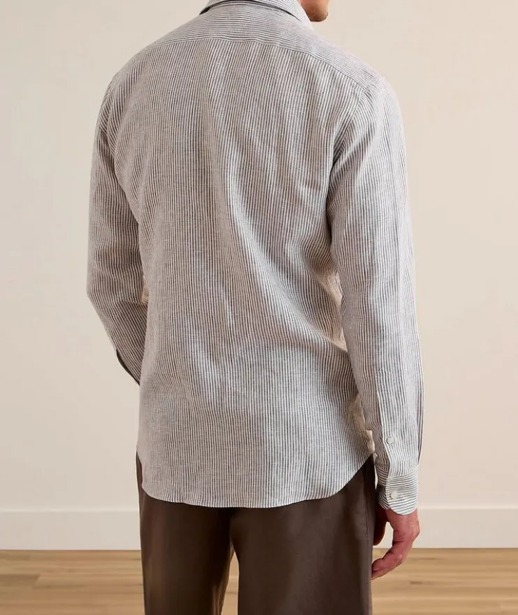 - Made from the brand’s exclusive, European-grown flax fibers and enhanced with hand-stitched details and a striped finish, this lightweight linen shirt offers a contemporary leisure look in a classic menswear staple.