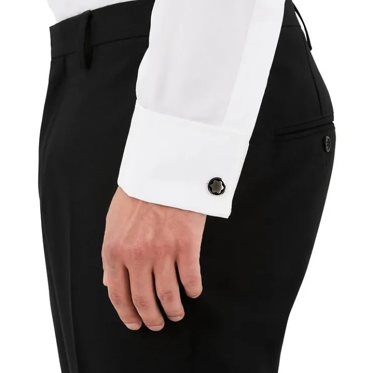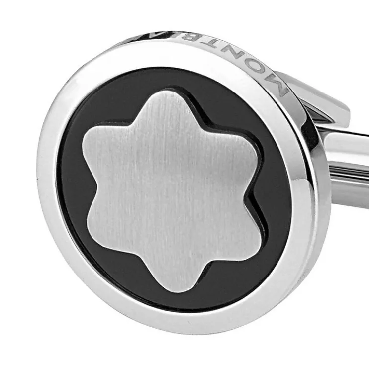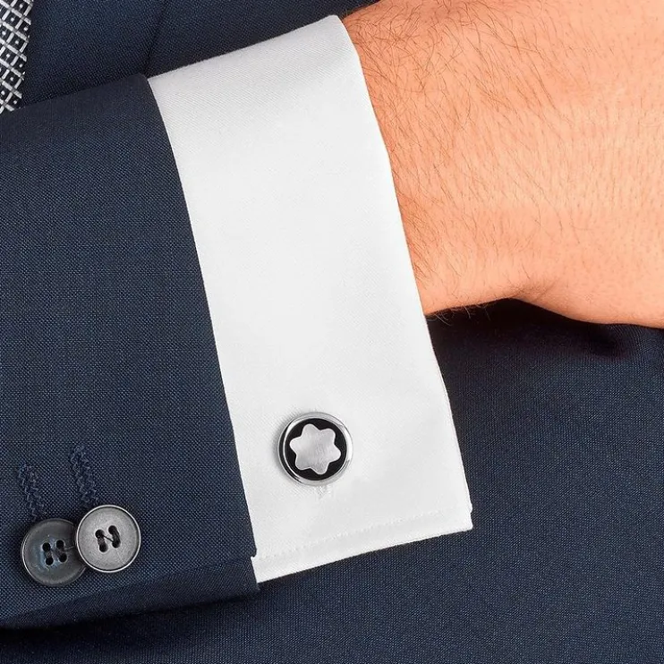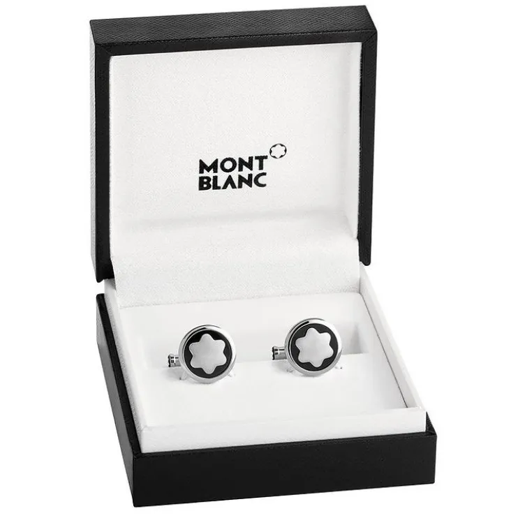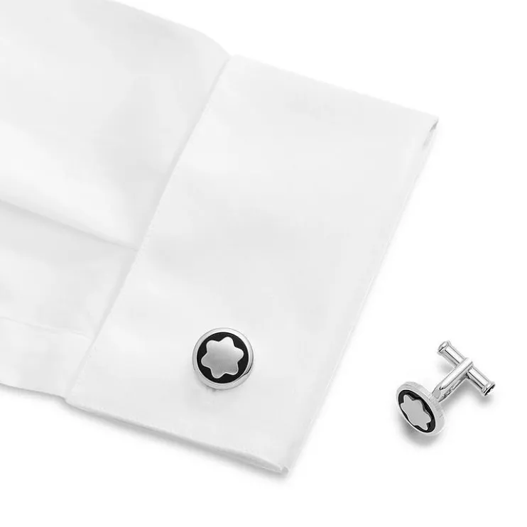 - These cufflinks from Montblanc celebrate understated style and elegance. Crafted from stainless steel, the timeless round shape is set with a black onyx inlay and the signature snowcap emblem.Team these with a variety of dress shirts to elevate your formal wear.