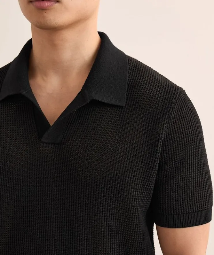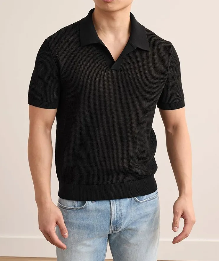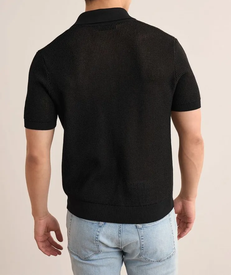 - A statement layer for travel and sun-soaked climates, this polo delivers a relaxed, minimalist profile with its open collar and crochet finish.