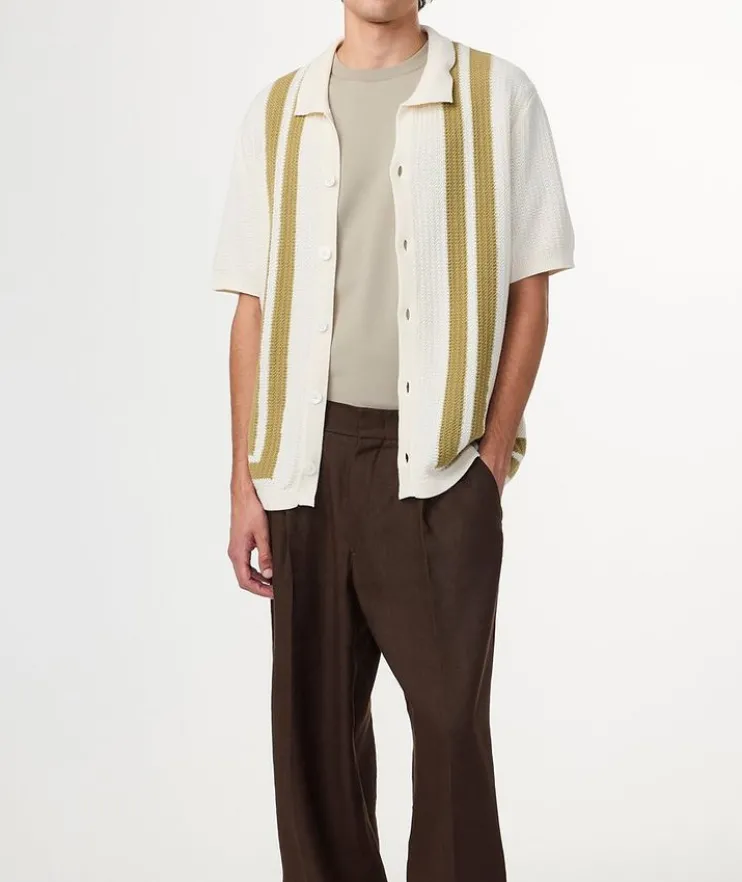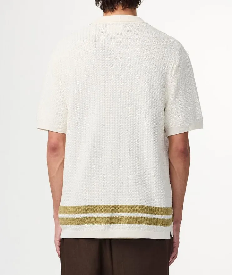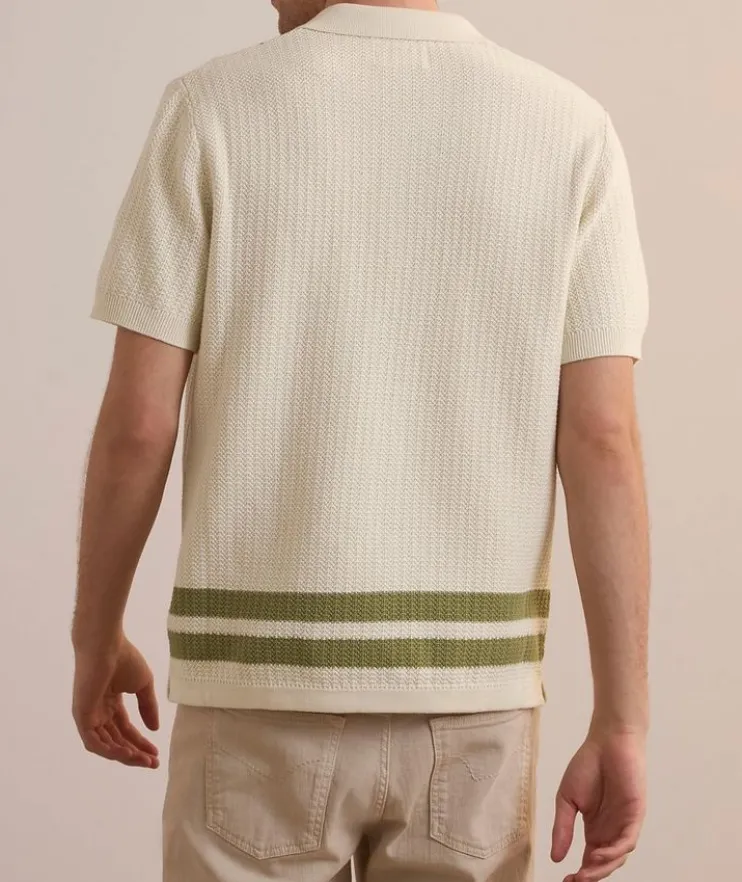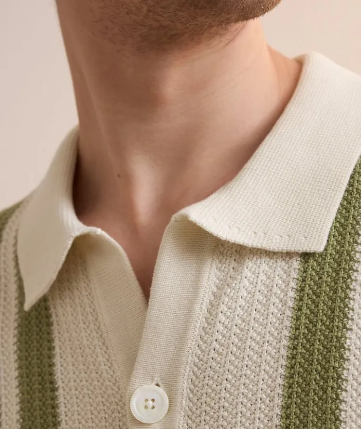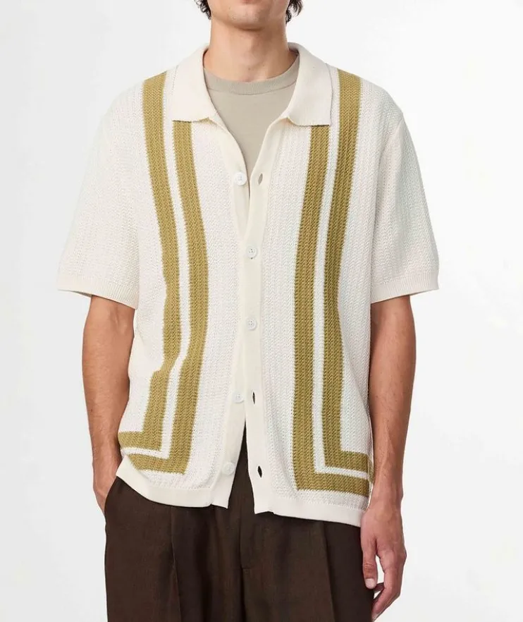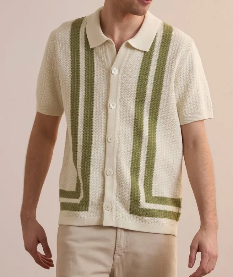 - Knitted shirt crafted from organic cotton features a textured stitch with stripe details and is finished with Mother-of-Pearl buttons.