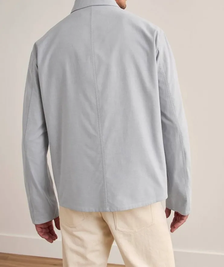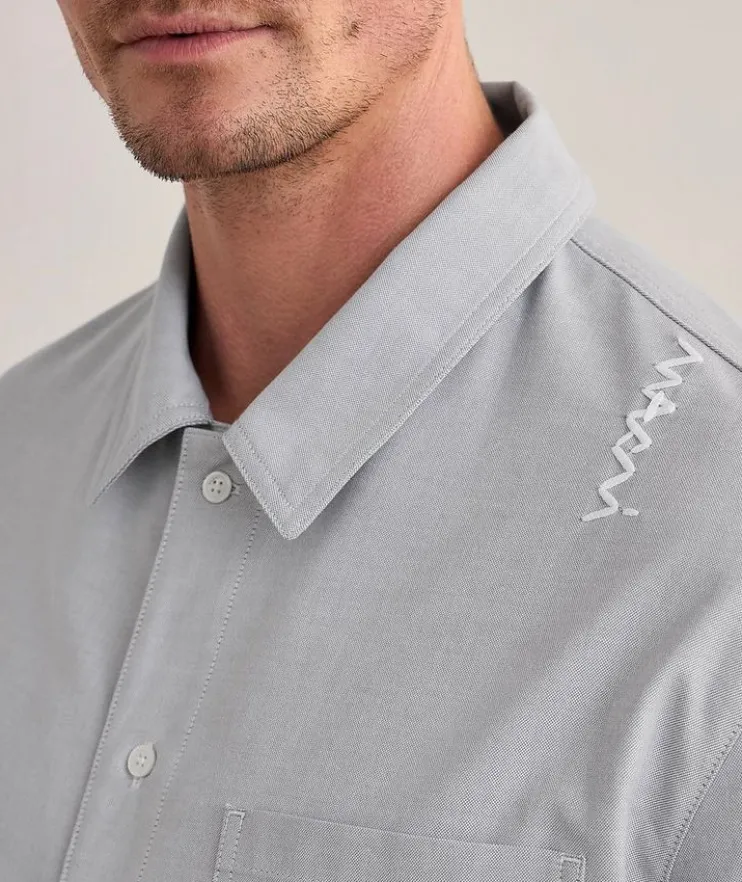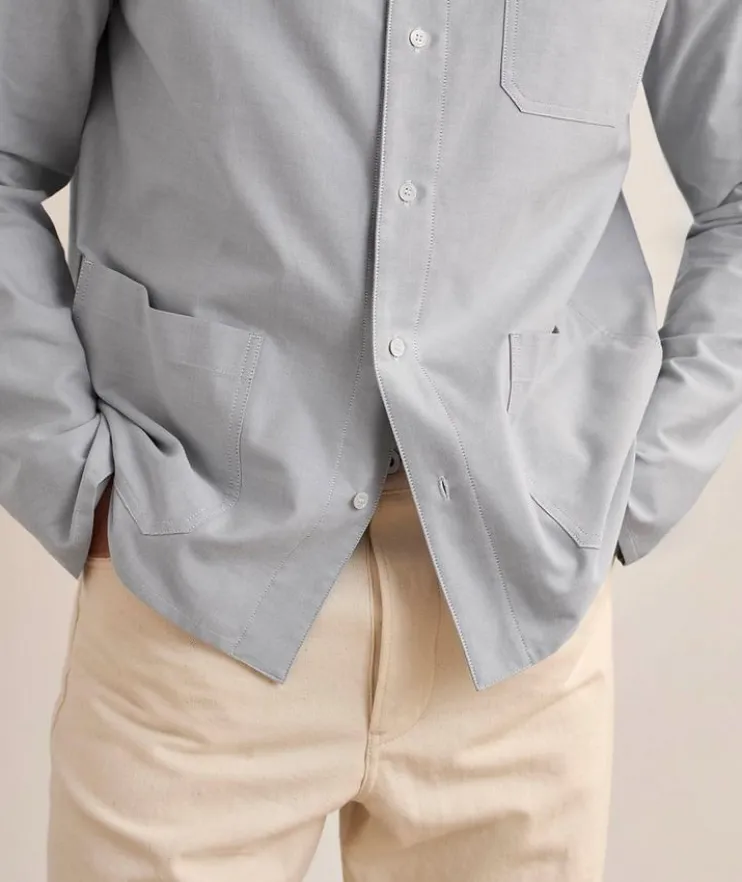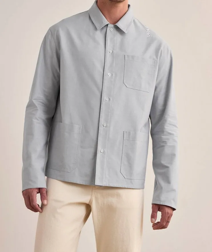 - This Oxford-style shirt jacket is cut from organic cotton in a relaxed fit, with Mother-of-pearl button details and a hand-embroidered logo at the shoulder for a contemporary edge. An easy layering piece to elevate casual ensembles, large pocket details add a level of practicality.