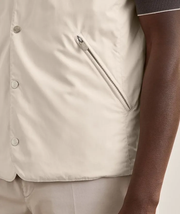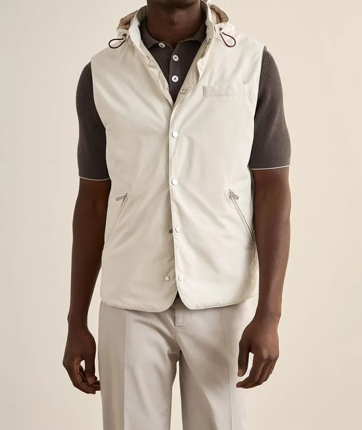 - Lightly padded for warmth and protection, this modern vest incorporates the classic codes of casual outerwear with a snap closure, side pockets and detachable hood.