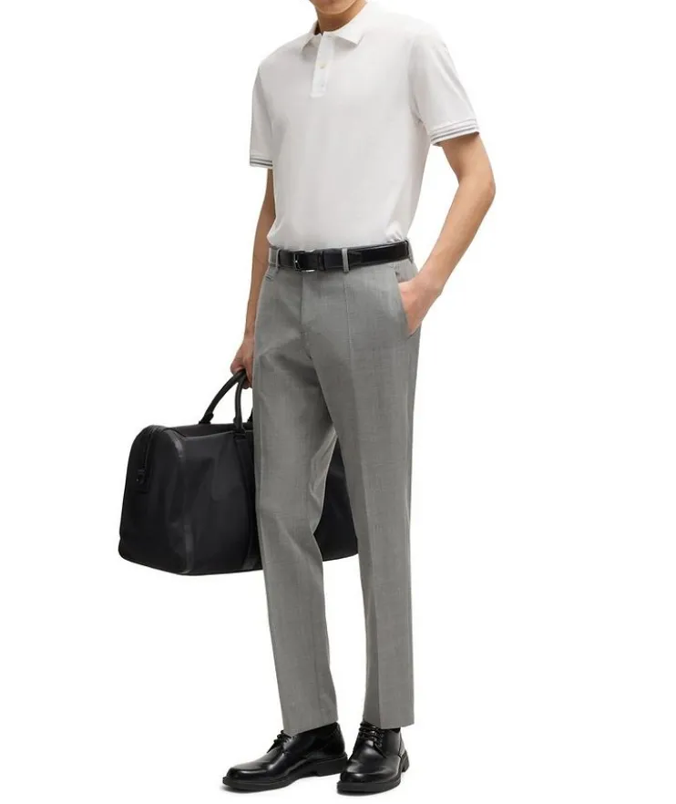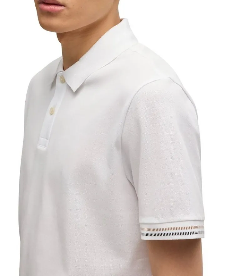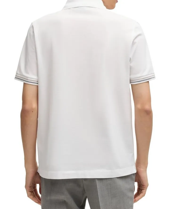 - A short-sleeved polo shirt in mercerized-cotton piqué by BOSS Menswear. This top is cut to a regular fit and detailed with stripe trims.