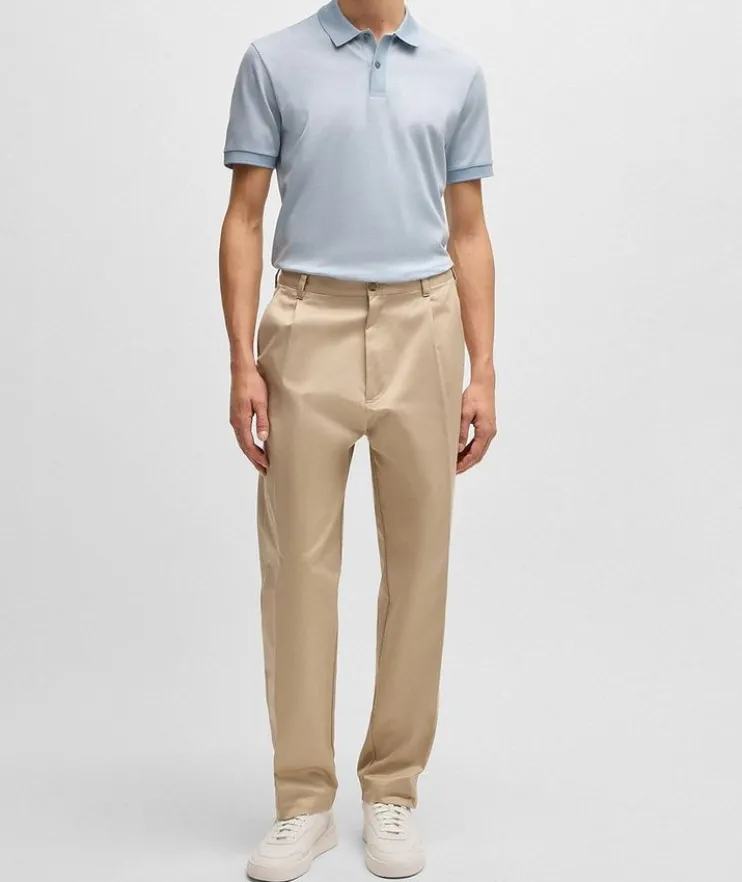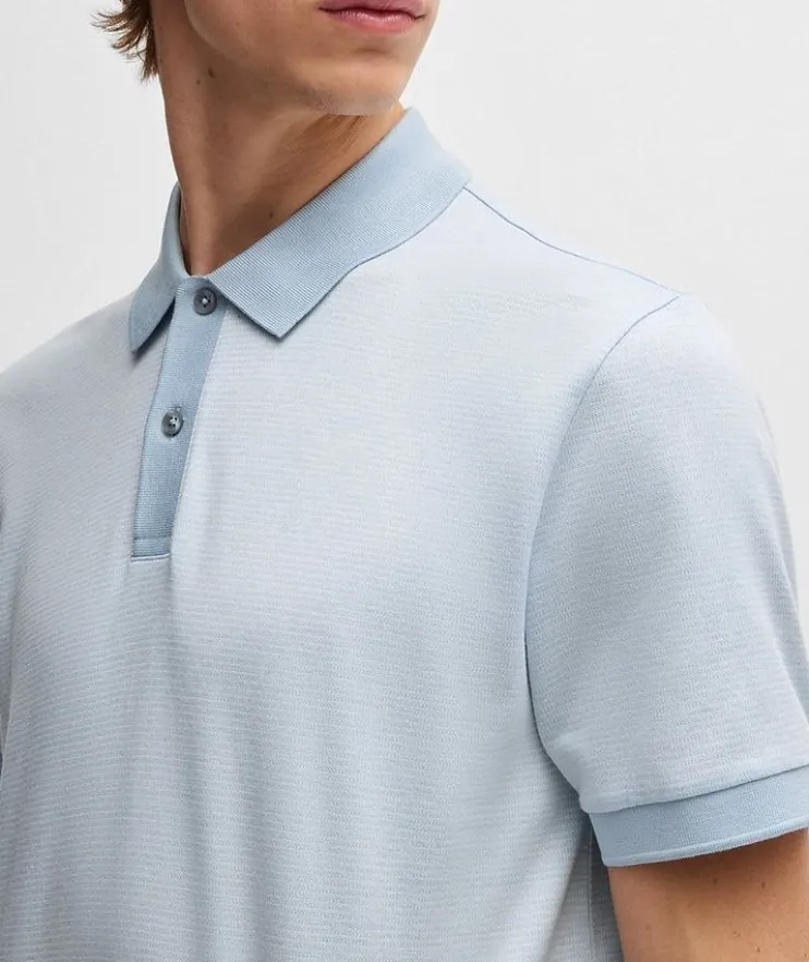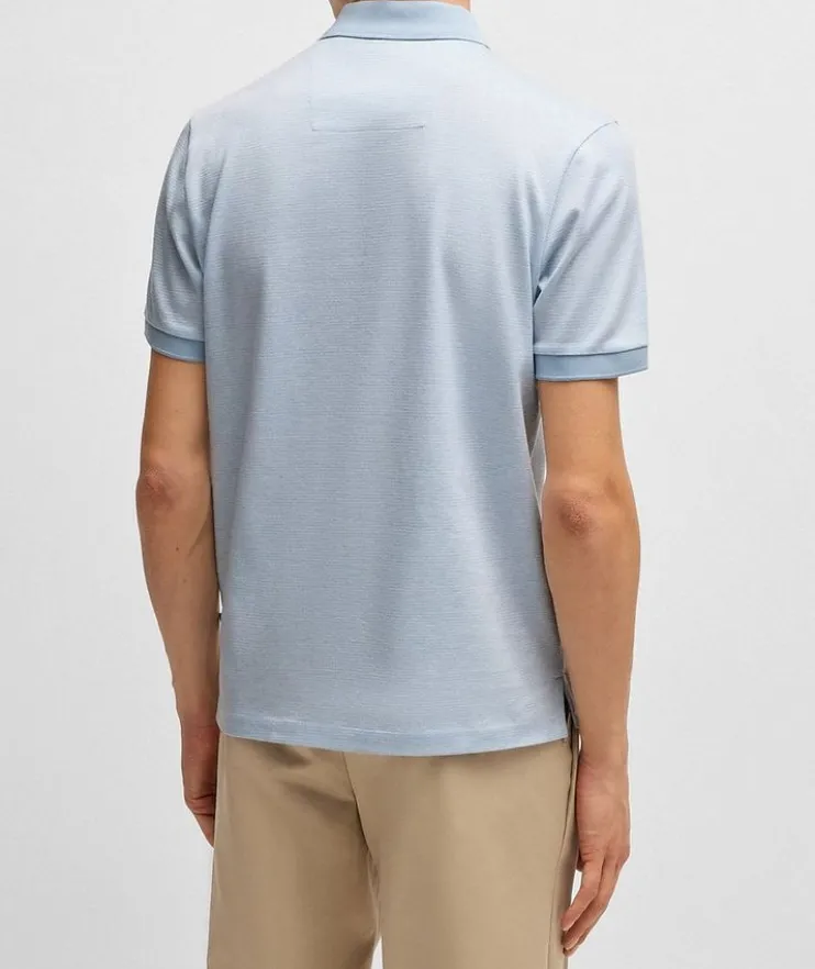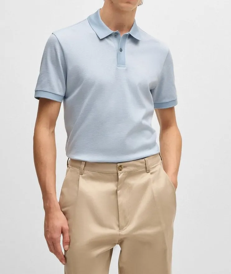 - An elevated polo shirt by BOSS Menswear. Featuring a three-tone pattern offset by solid trims, this short-sleeved polo shirt is crafted in cotton with a mercerized finish for a richer, softer touch. The regular fit delivers an easy silhouette.