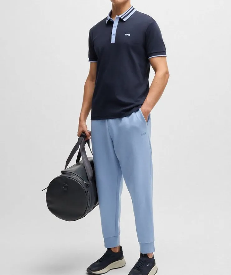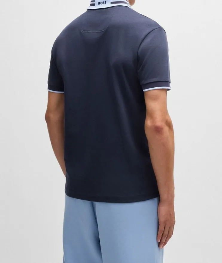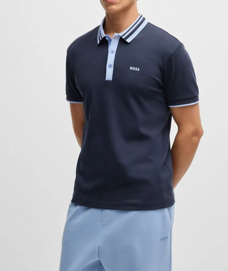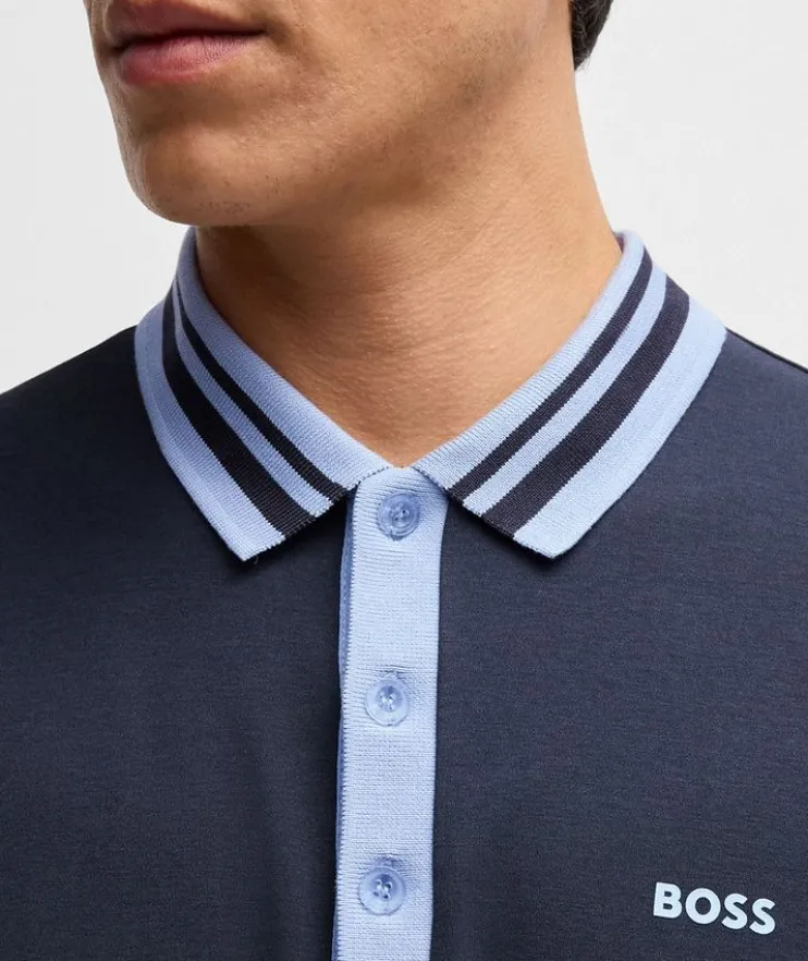 - A slim-fitting polo shirt in soft interlock cotton by BOSS Menswear. This modern piece features branding and stripes on the collar.