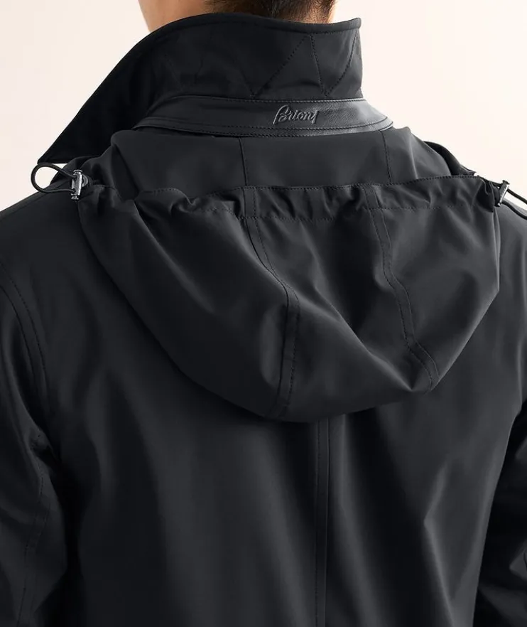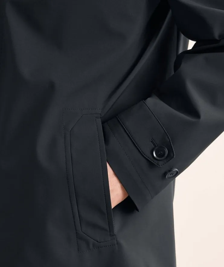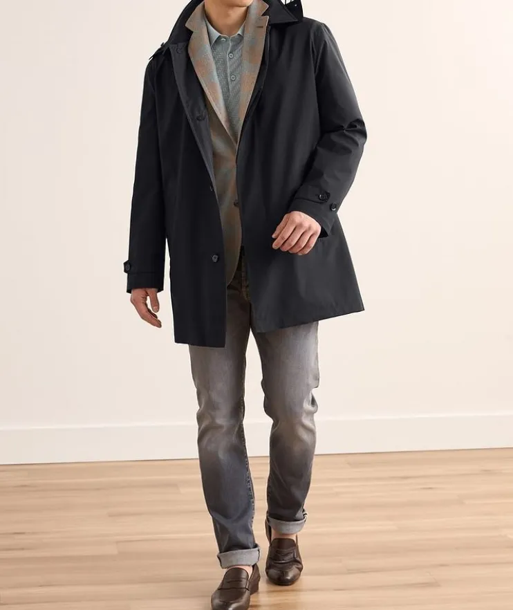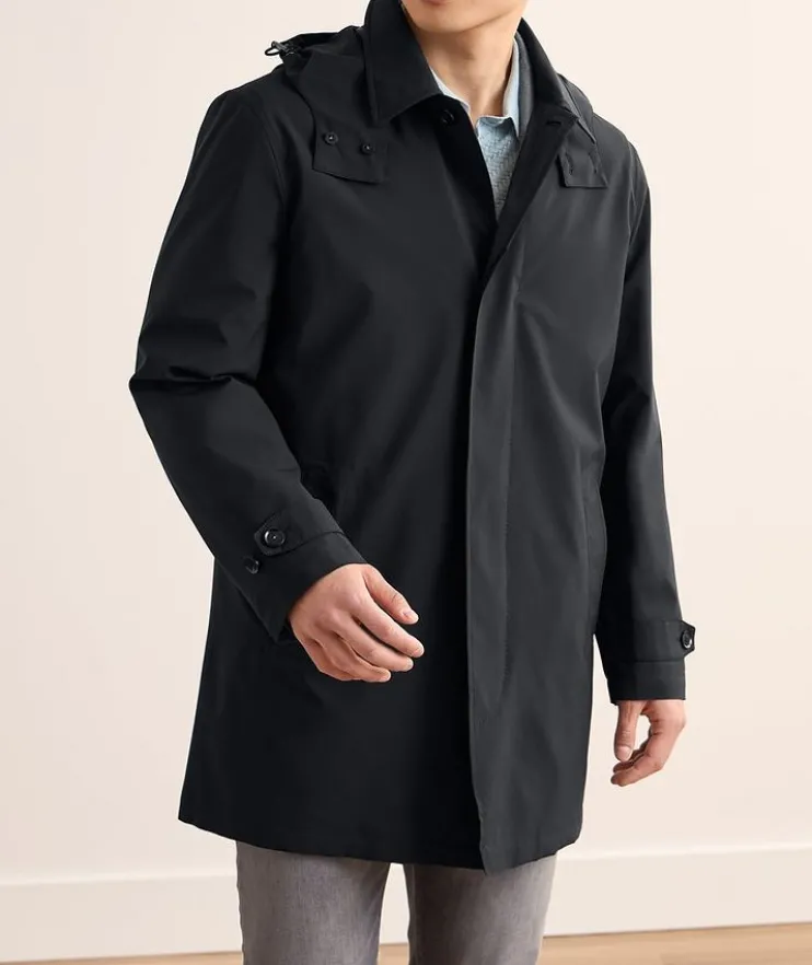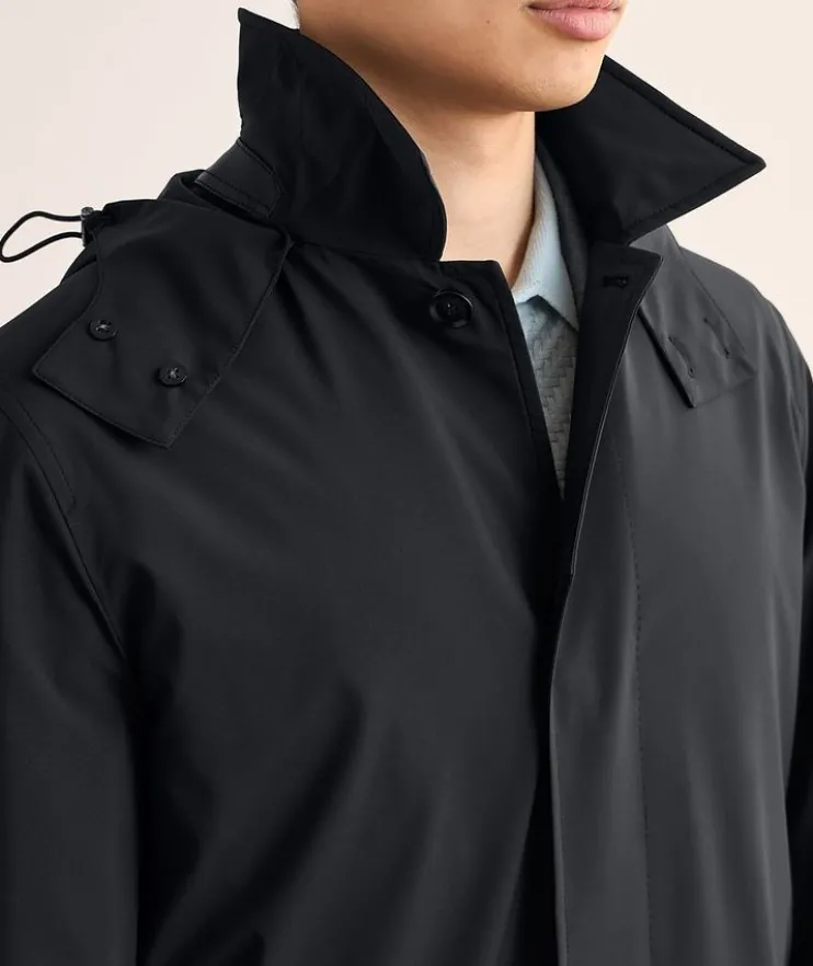 - Lightweight car coat in a streamlined silhouette with removable hood for versatile styling.