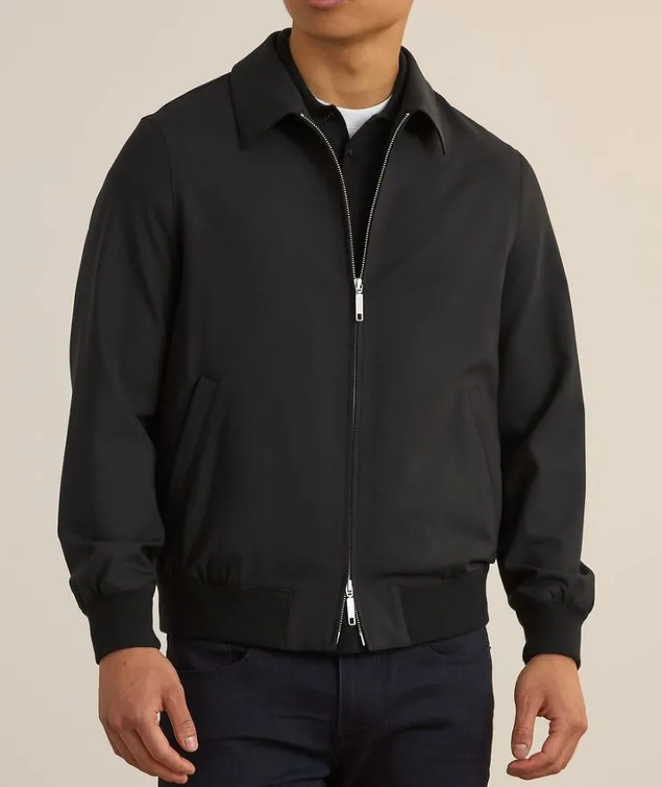 - An expression of timeless elegance and sophistication, this meticulously crafted bomber is presented with a two-way zipper closure, zipper pockets and framed with a classic collar soft ribbed trim.