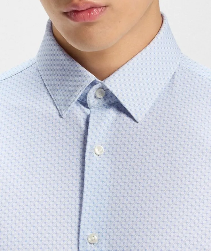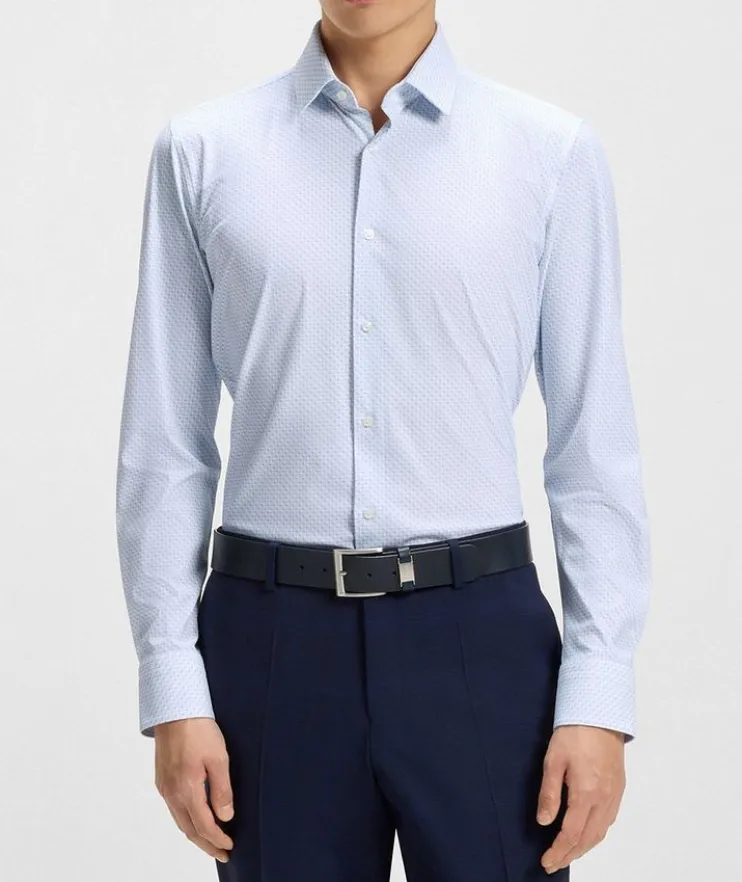 - Tailored in a slim fit from super-stretch jersey for comfort and movement, this dress shirt is a business essential. Finished in a contemporary dot print for personal touch.