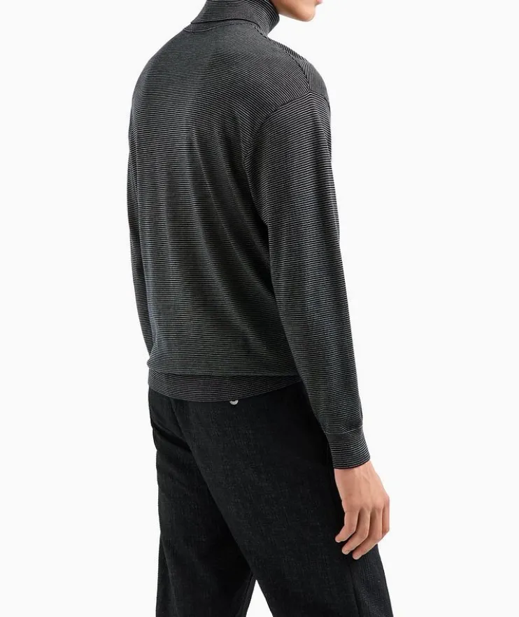 - Renowned for its moisture-wicking and breathable comfort, this turtleneck jumper is crafted in a fine knit virgin wool and Lyocell blend and finished with a horizonal jacquard micro-striped motif.