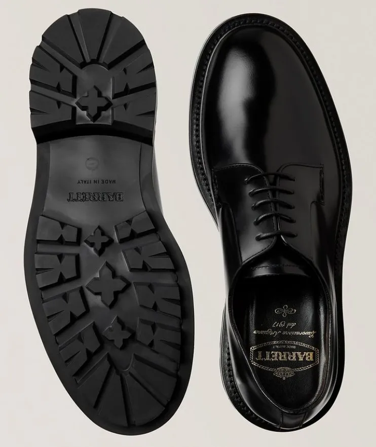 - Combining formal elegance with absolute comfort, these handcrafted leather derbies present with a polished plain toe silhouette, exquisite Blake construction and a classic stacked heel.