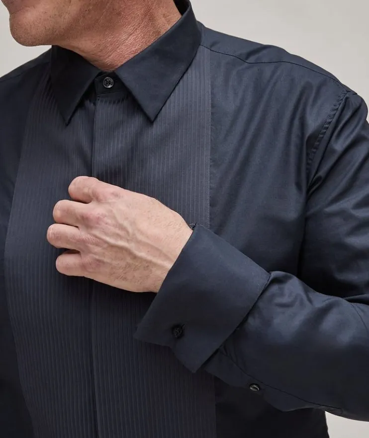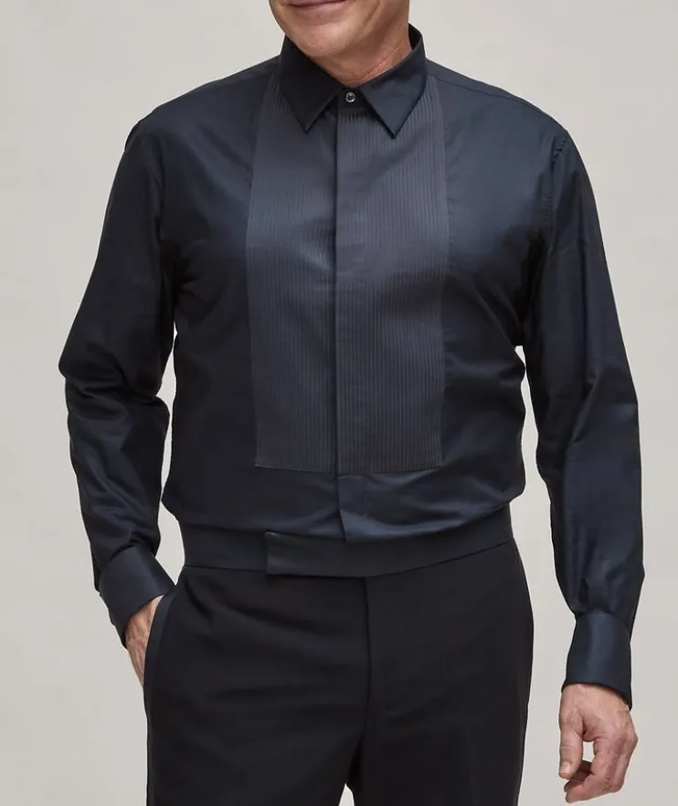 - Giorgio Armani has become an emblem for Italian class and elegance. The designer’s perfectly proportioned dress shirts illustrate his indisputably luxurious approach ¿ case in point, this luxuriously tailored tuxedo style. It’s crafted in Italy from crisp cotton, detailed with a pleated bib front, French cuffs and a sleek point collar; removable collar stays ensure a sharp shape over time. Add a sophisticated flair to your look when attending formal events in this elevated button-down.